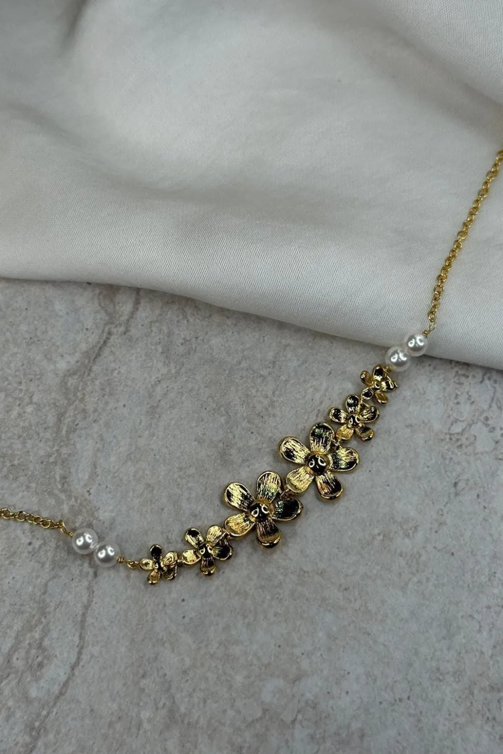 Ørestikker fra Molly&My Jewellery med blomsterdesign i gylden farve. Smykket er lavet af rustfrit stål og har hvide perler.