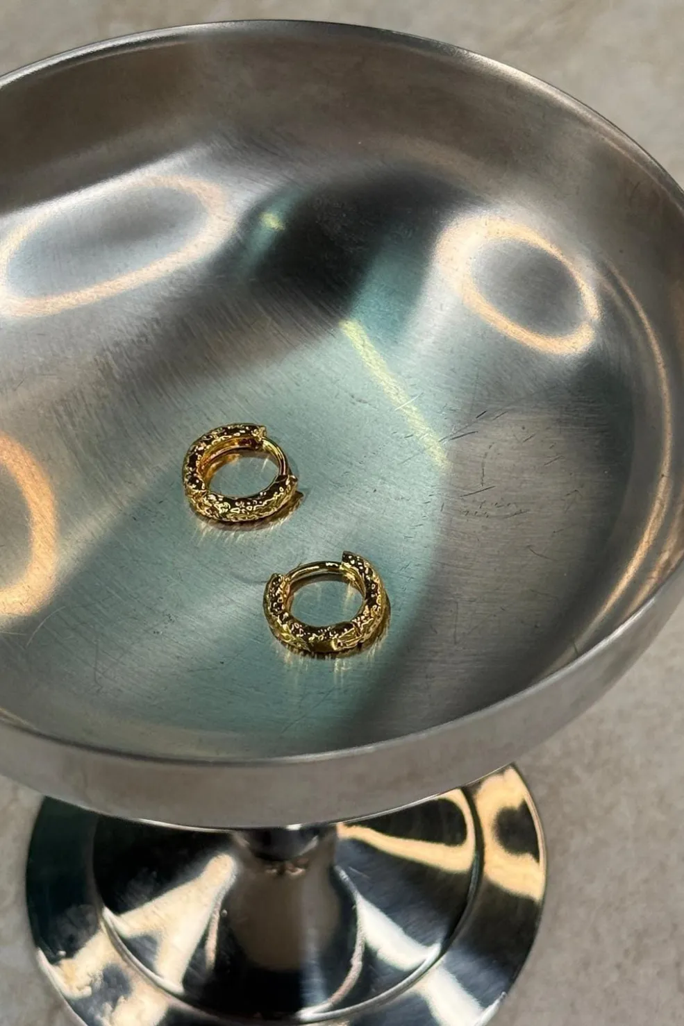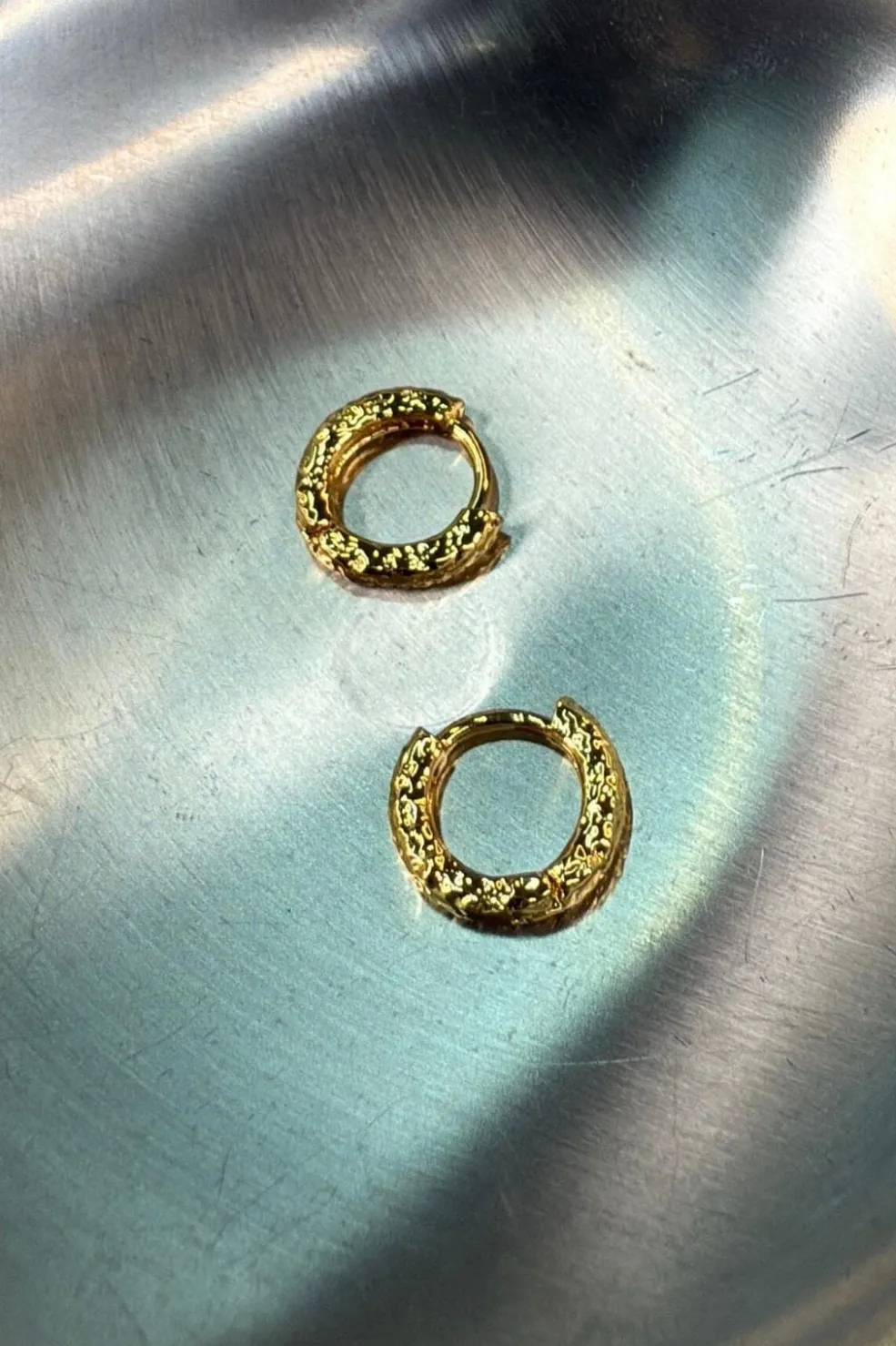 Gyldne øreringe fra Molly&My Jewellery med en cirkulær form og en detaljeret overflade. Øreringene er forgyldte og har en hængsel-lukning.