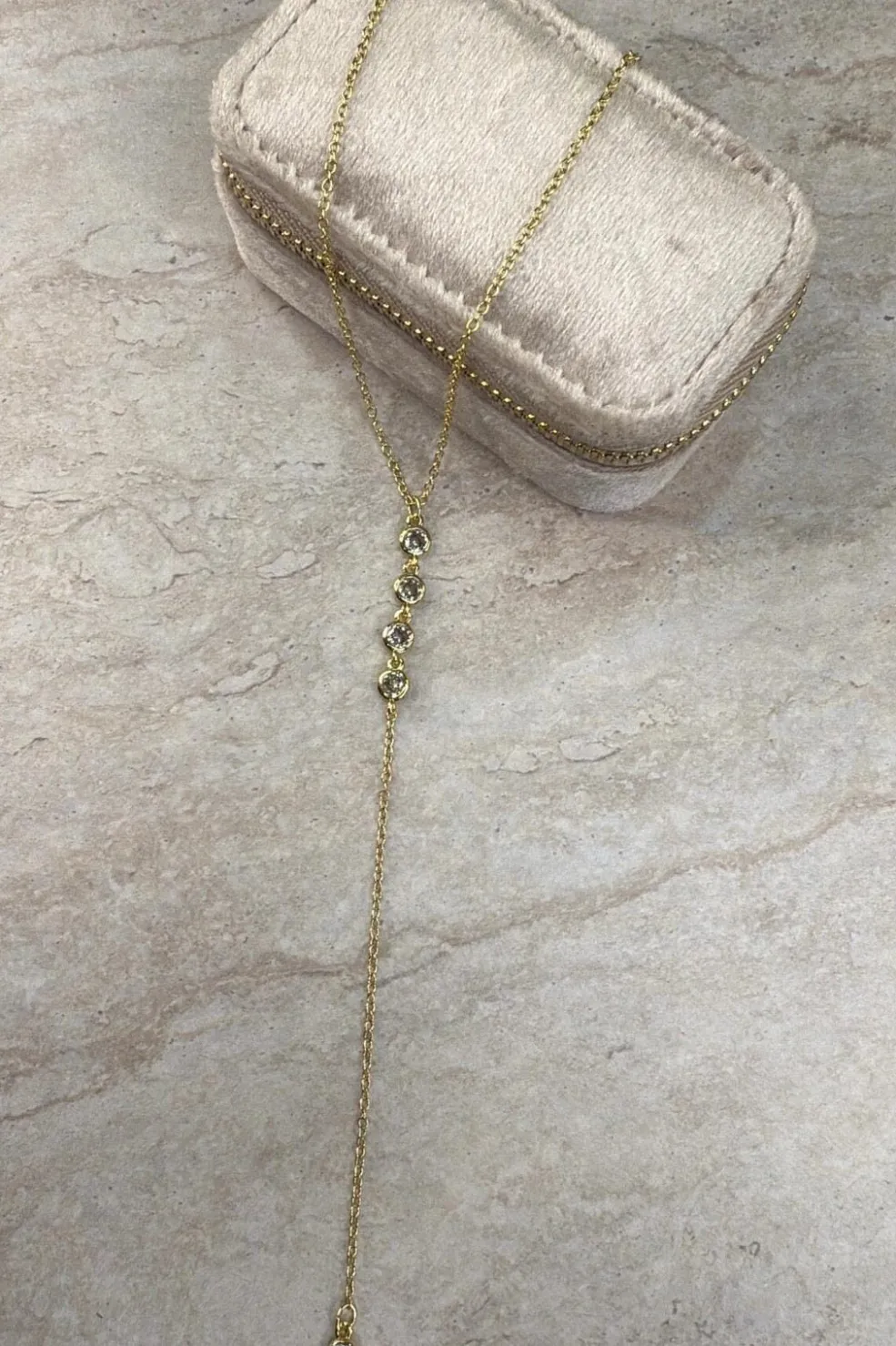 Forgyldt halskæde fra Molly&My Jewellery med Y-kæde-design. Kæden er lavet af messing og har små cirkulære elementer med sten.