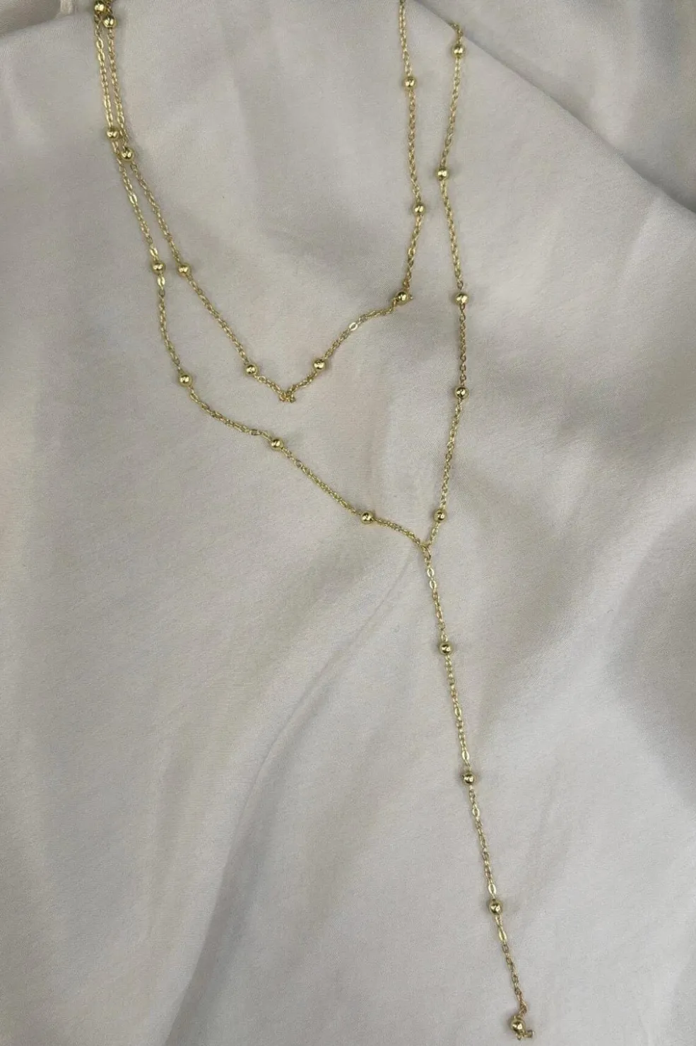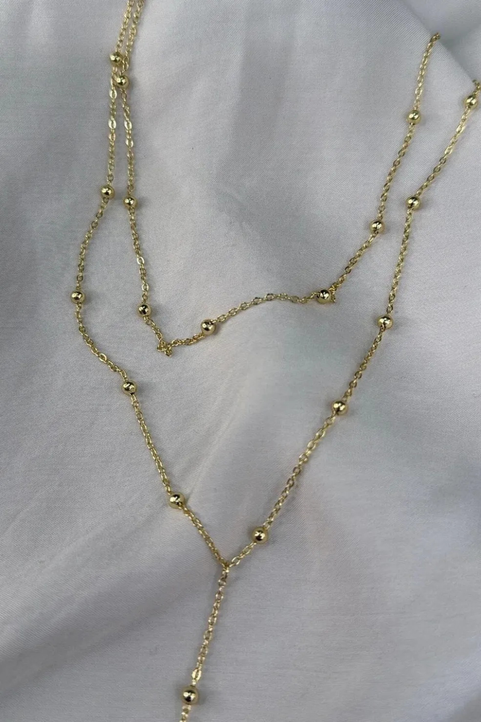 Forgyldt halskæde fra Molly&My Jewellery med små kugler fordelt langs kæden. Designet har flere lag og en Y-formet struktur.