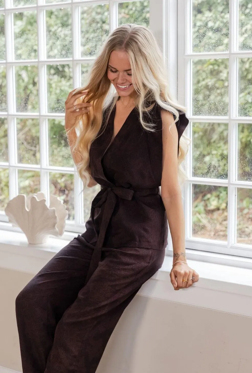 Mørkebrun vest fra Molly&My x Julie Elgaard, lavet af polyester. Vesten har v-hals, ærmeløst design og bælte i taljen.