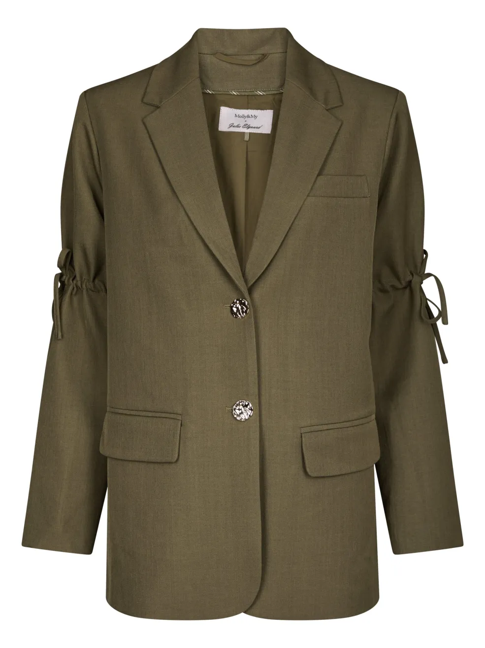 Blazer fra Molly&My x Julie Elgaard i khaki grøn. Blazeren har snøredetaljer på ærmerne, dekorative knapper foran og to frontlommer med flapper.