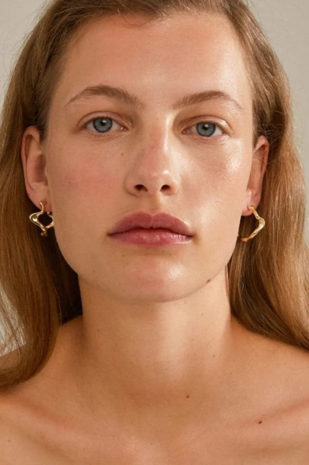 Gyldne øreringe fra Pilgrim med et bølget, skulpturelt design. Øreringene er fremstillet af genanvendt messing med en blank guldbelægning, der fremhæver det organiske formsprog.