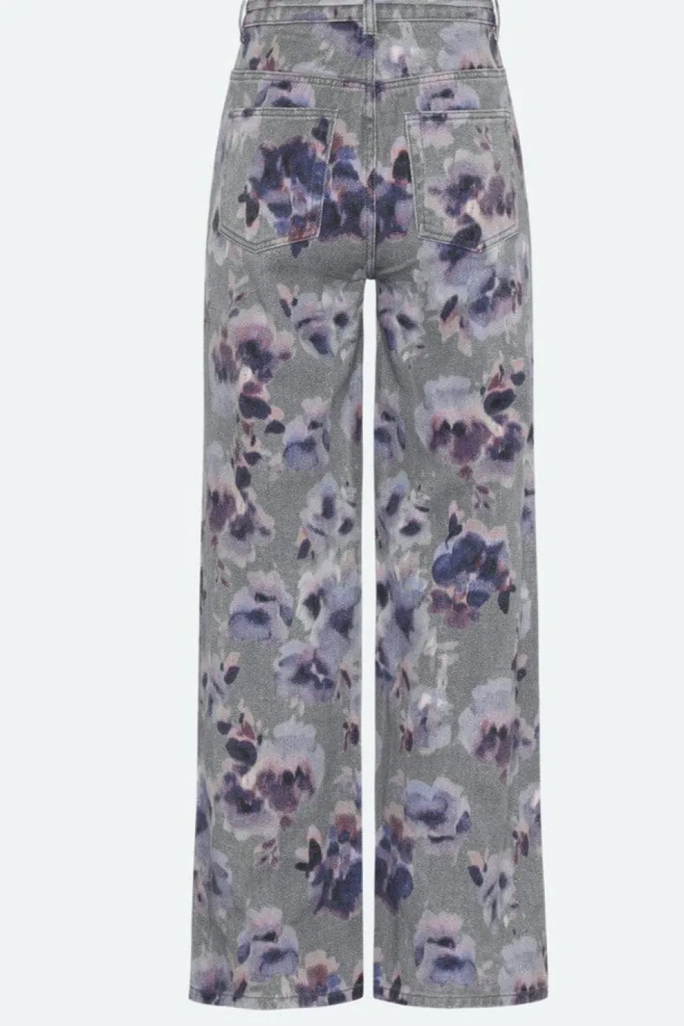 Jeans fra Moves by Minimum med et blomstermønster i grå og lilla nuancer på en grå bund. Bukserne har en høj talje med bindebånd og en løs pasform gennem benene.