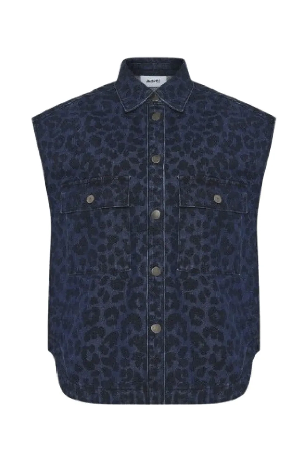 Mørkeblå vest fra Moves by Minimum med leopardprint. Vesten har skjortekrave, brystlommer og trykknapper foran. Den løse pasform giver god bevægelsesfrihed.