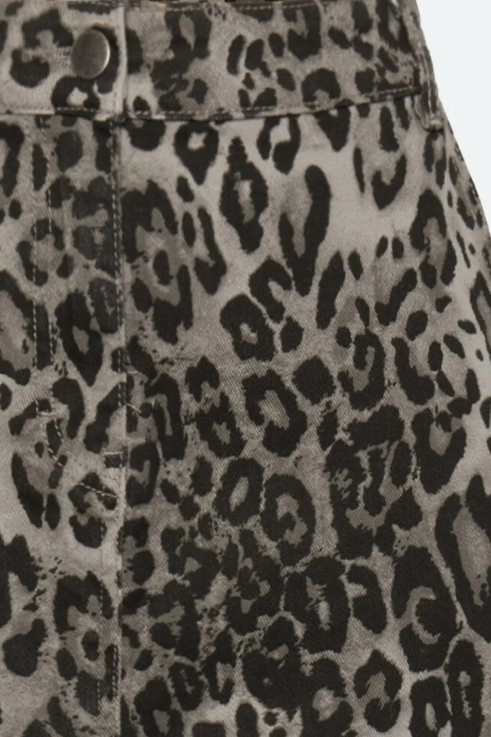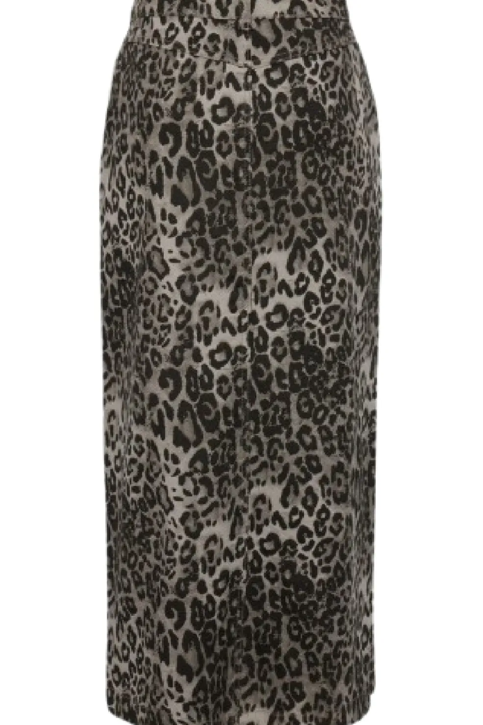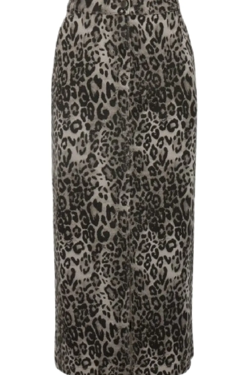 Nederdel fra Moves By Minimum i grå med sort leopardmønster. Den har en længde til læggene og en praktisk frontslids. Nederdelen sidder i normal taljehøjde med knap- og lynlåslukning.