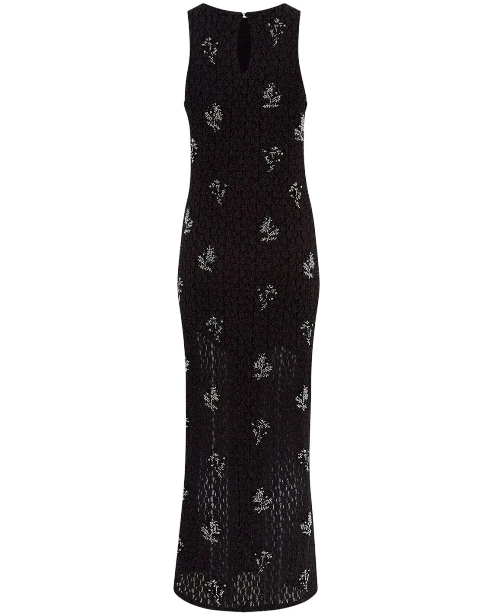 Sort kjole fra Moss Copenhagen med sølvbroderier, pailletter og blonde. Kjolen er ankellang og ærmeløs med en rund halsudskæring. Den passer til festlige og formelle begivenheder.