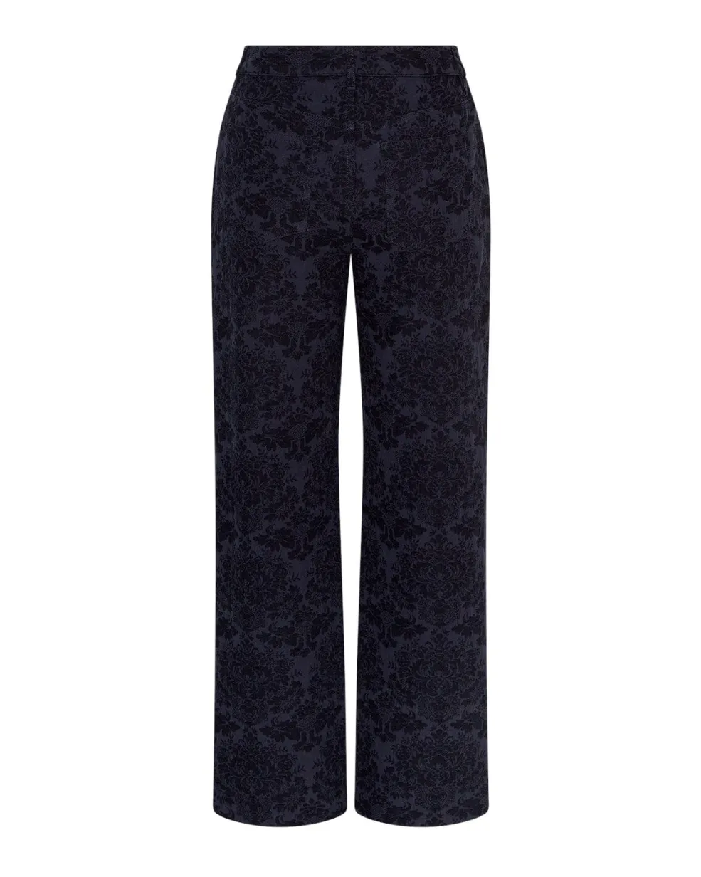 Bukser fra Moss Copenhagen i mørkeblå farve med blomsterprint. Bukserne har høj talje og bred benform med ankel-længde.