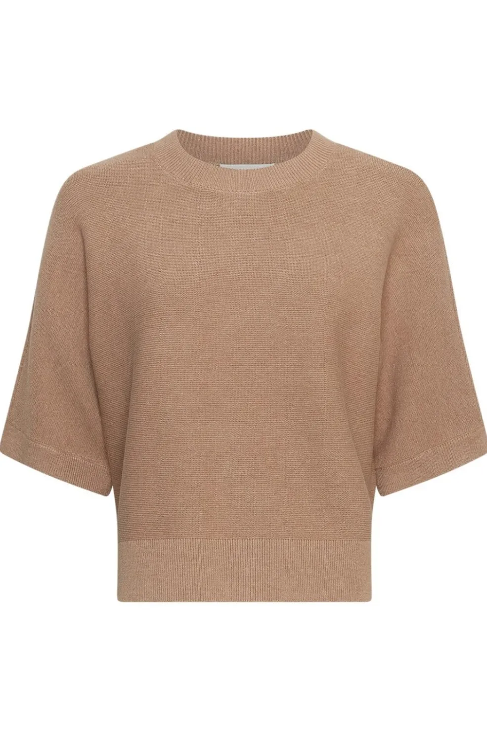Pullover fra Moss Copenhagen i beige meleret strik med 3/4 ærmer og rund halsudskæring. Pulloveren har ribkanter ved ærmerne og i bunden.