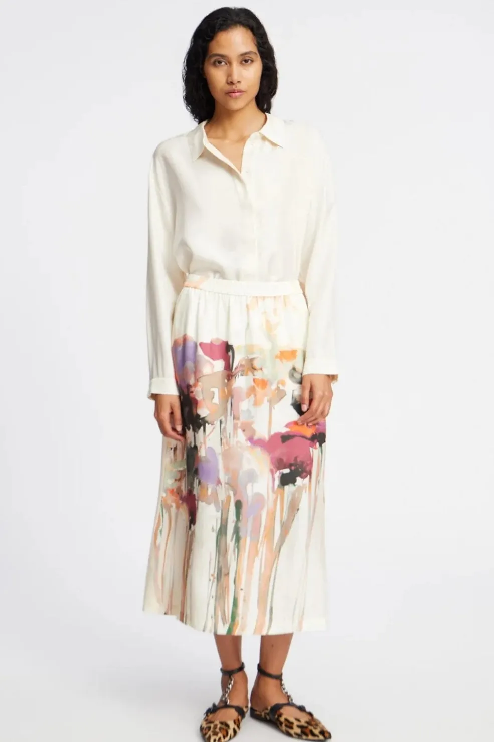 Sandfarvet nederdel fra Munthe med et kunstnerisk blomsterprint i pink, orange og lilla nuancer. Den har en elastisk talje og går til midt på læggen.