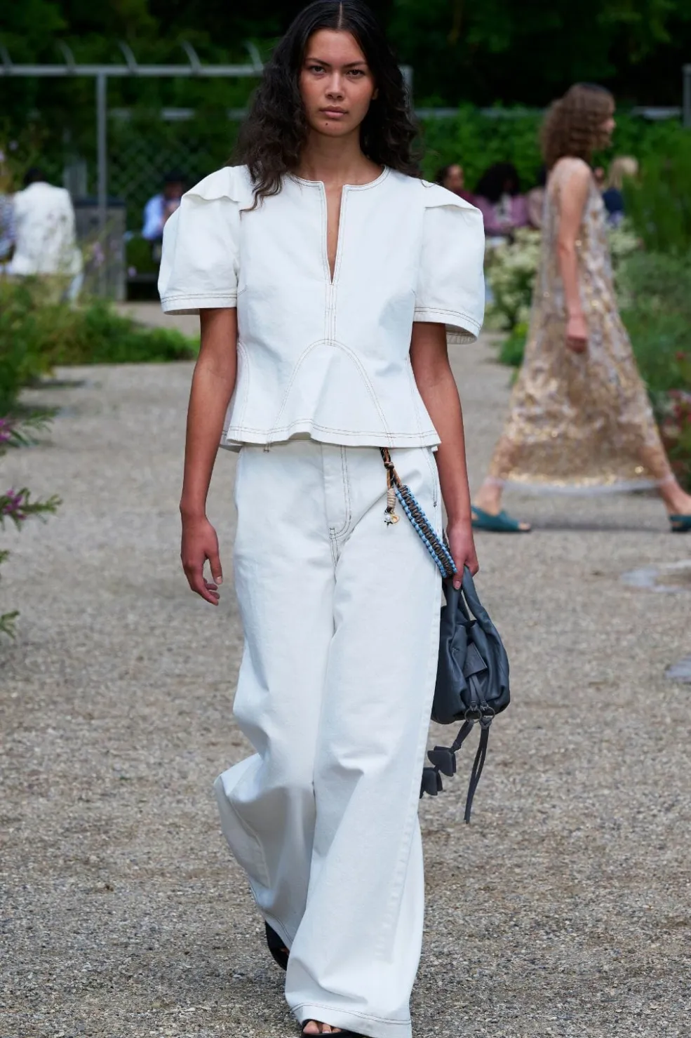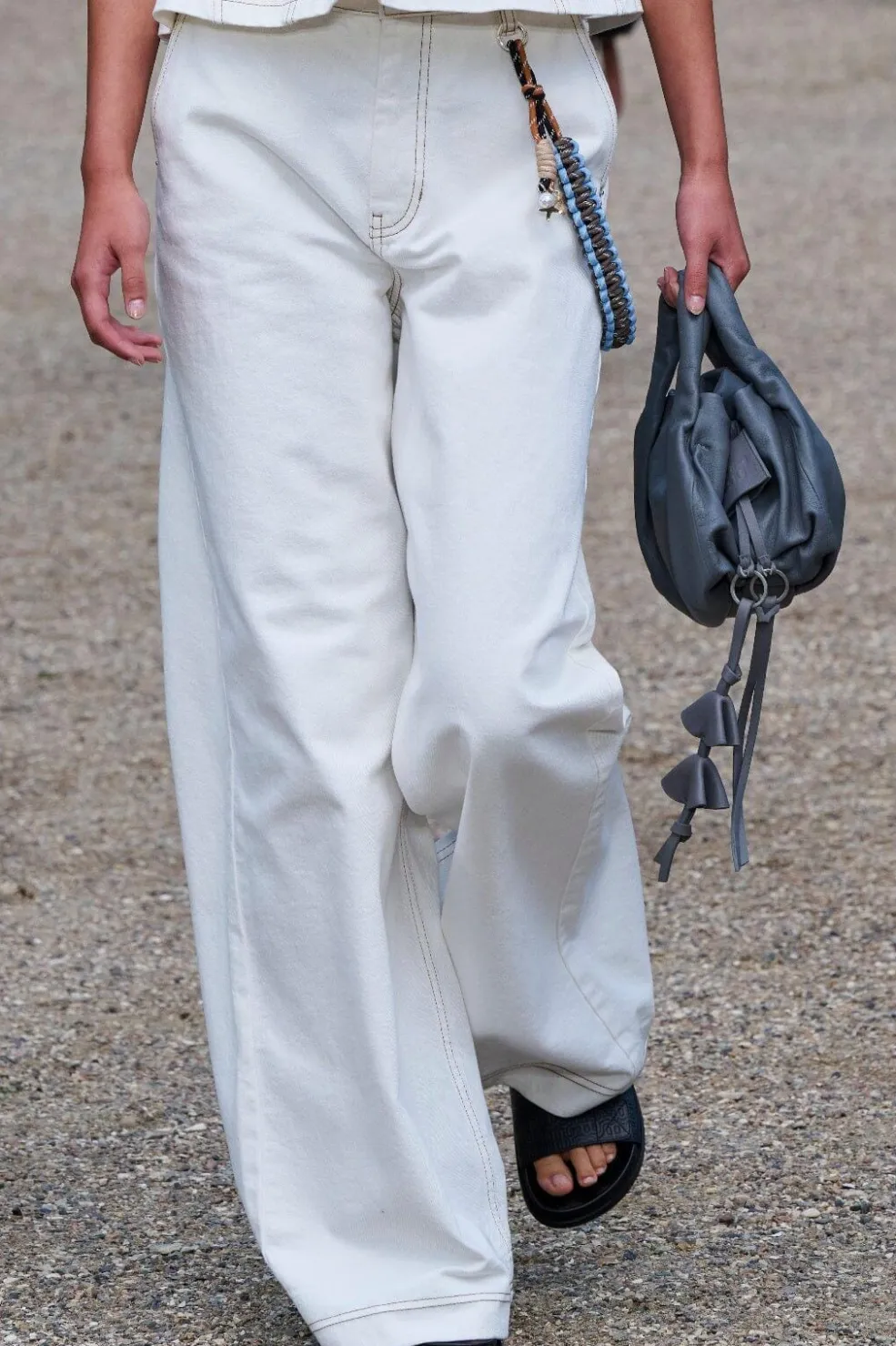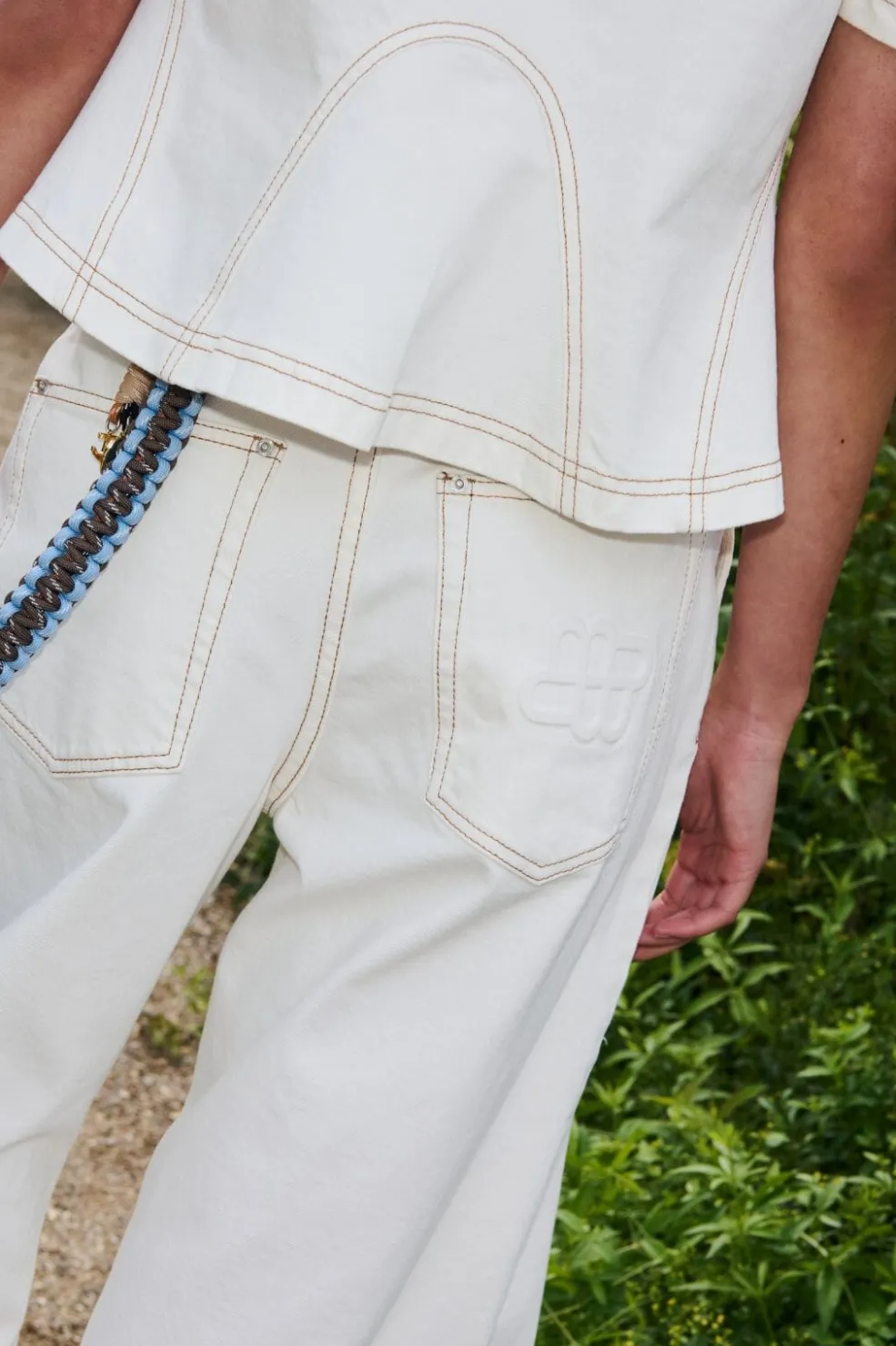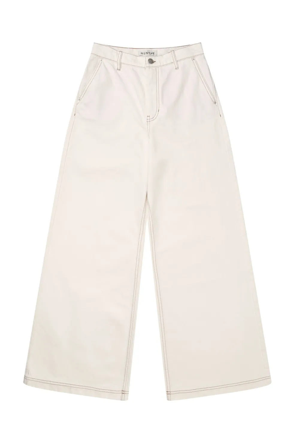 Bukser fra Munthe i en lys elfenbensfarve. De er lavet af 99 % økologisk bomuld med 1 % elastan.