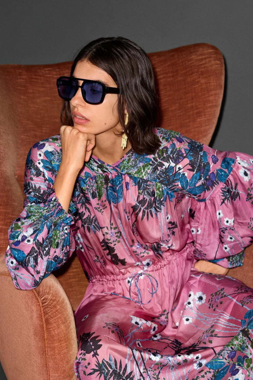 Langærmet kjole fra Munthe, lavet af en blanding af viskose og silke. Kjolen har et blomsterprint i pink og bærfarver på en løs pasform.