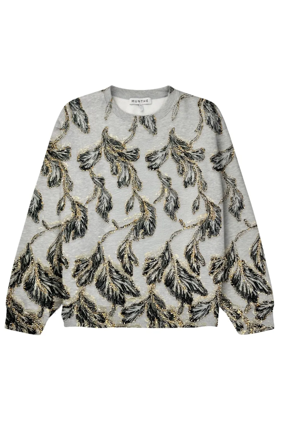 Sweatshirt fra Munthe med broderet bladmønster i guld og sort. Den løse model har rund hals og lange ærmer med pailletter og broderi som dekorative elementer.