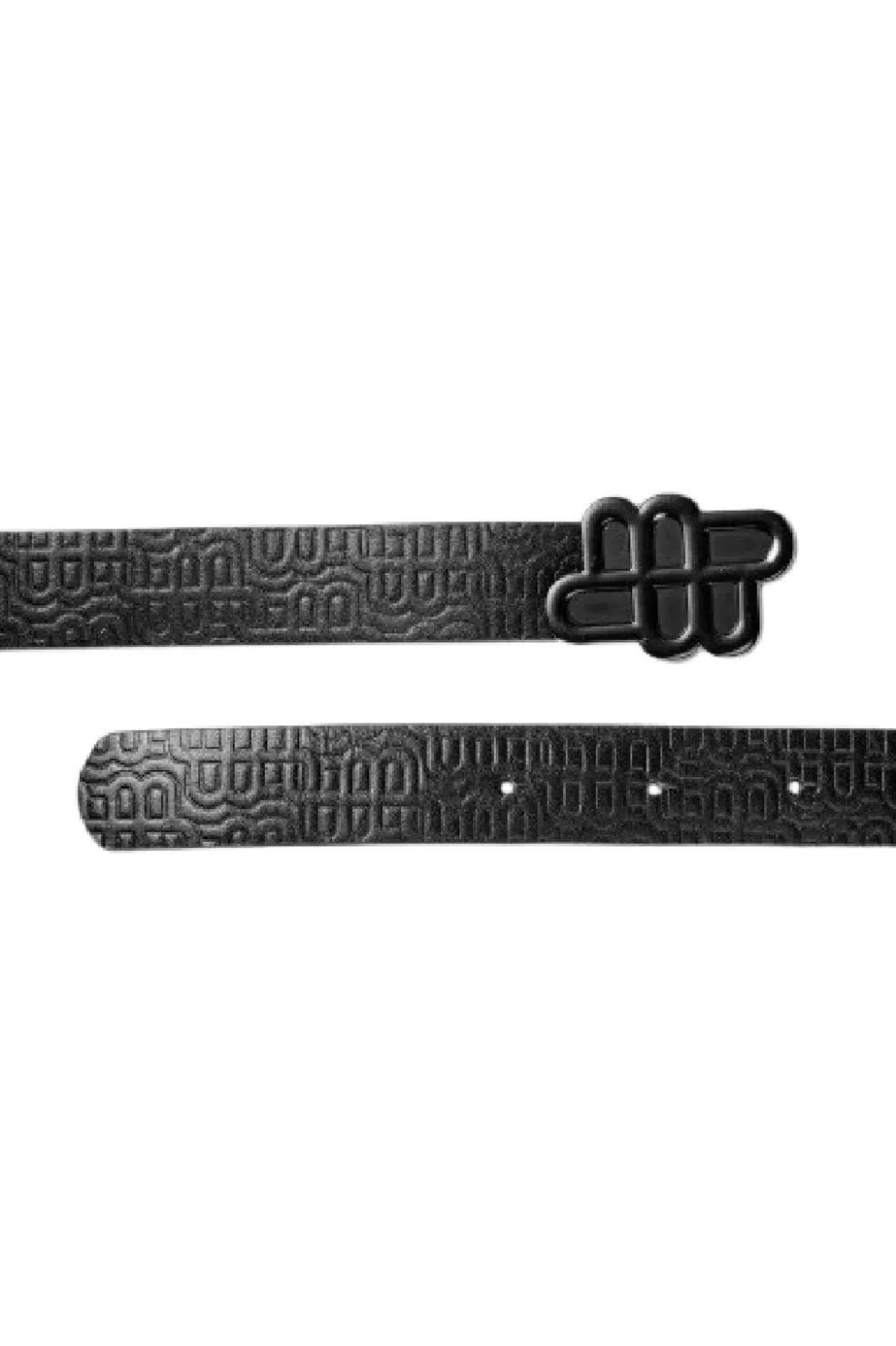 Sort læderbælte fra Munthe med mønster over hele overfladen. Bæltet har en karakteristisk spændelukning med Munthe-emblem og justerbare huller.