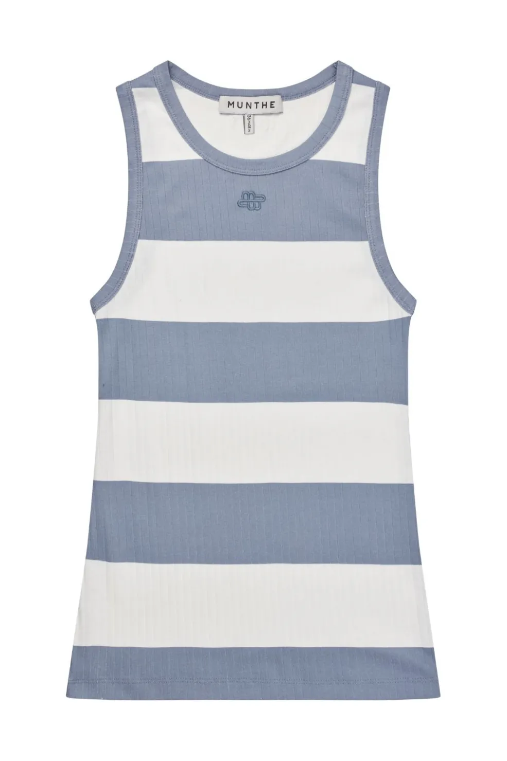 Ærmeløs top fra Munthe med vandrette striber i blå og hvid. Toppen har et lille, broderet Munthe-logo på brystet.