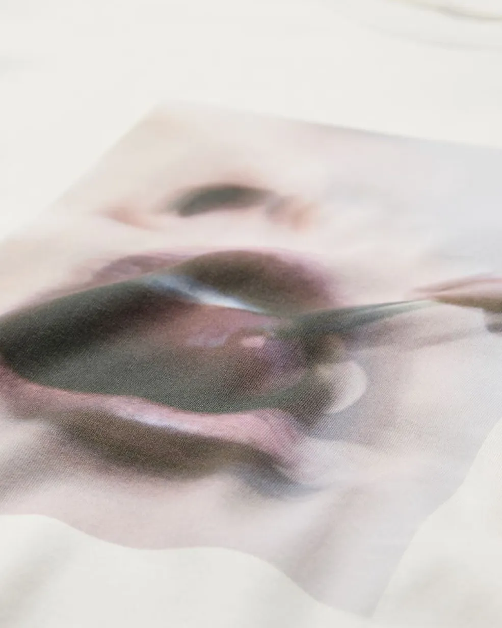 Hvid t-shirt fra Copenhagen Muse med et kunstnerisk print på forsiden. Printet viser læber og en hånd med et værktøj i en dramatisk komposition.