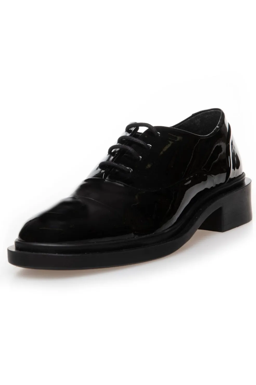 Sorte patentlædersko fra Copenhagen Shoes med snørebånd. De blanke sko har en lav blokhæl og firkantet tå.