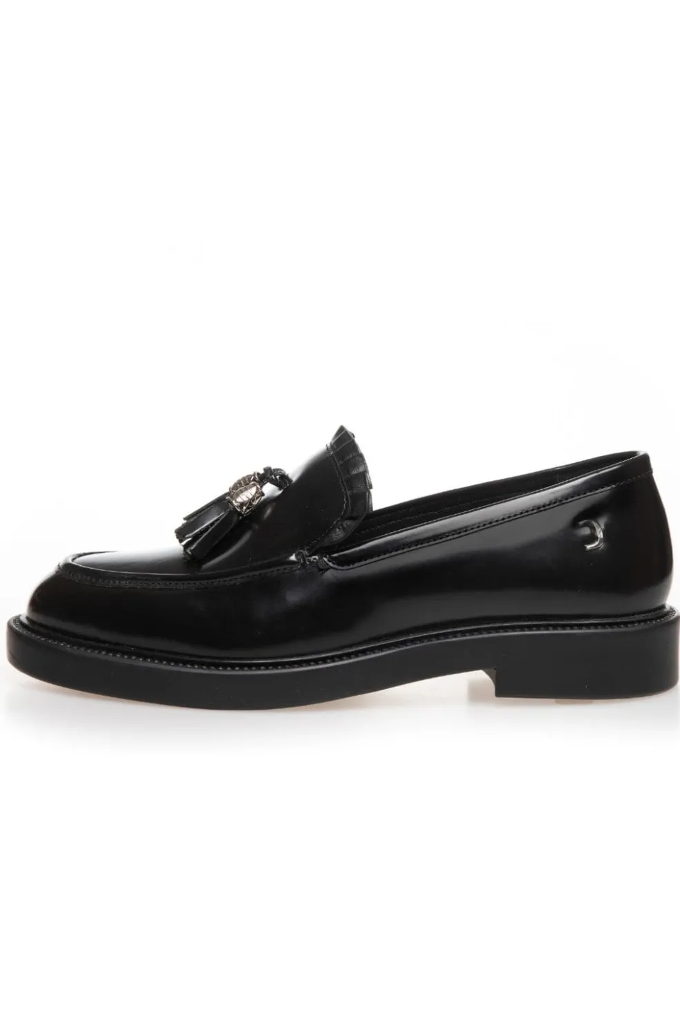Sorte loafers fra Copenhagen Shoes i læder med kvaster og sølvpynt. Skoene har en firkantet tå og lav hæl, som giver et klassisk udtryk.