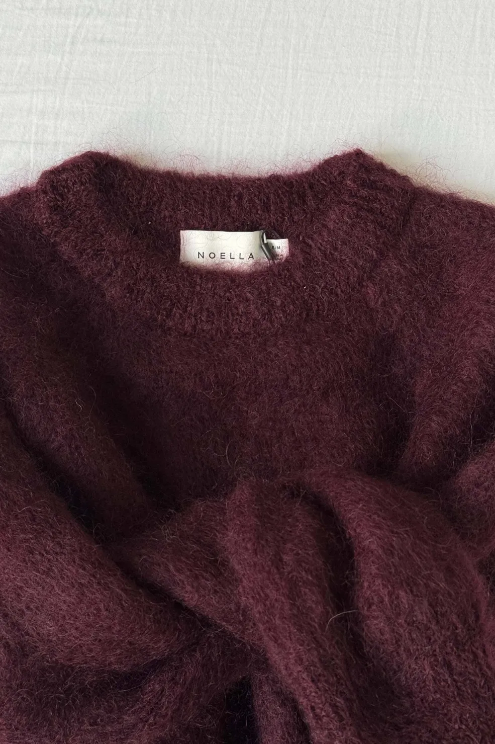 En vinfarvet sweater fra Noella, strikket i en blød mohairblanding. Den har en løs pasform med raglanærmer og en rund hals.