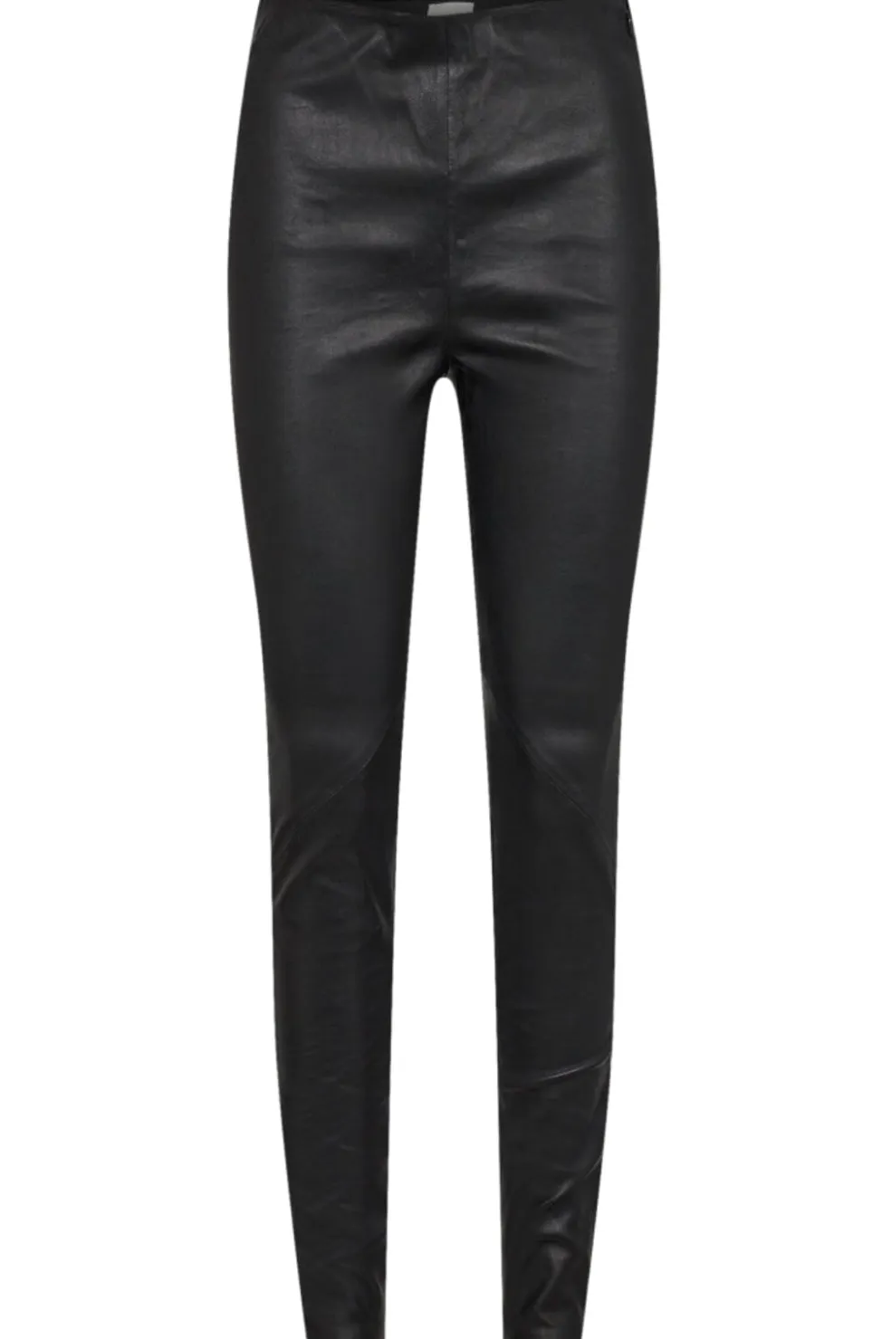 Sorte bukser fra Gossia i 100 % lammeskind med tætsiddende pasform. Bukserne har en glat overflade og en regulær taljehøjde, der giver et rent og enkelt udtryk.