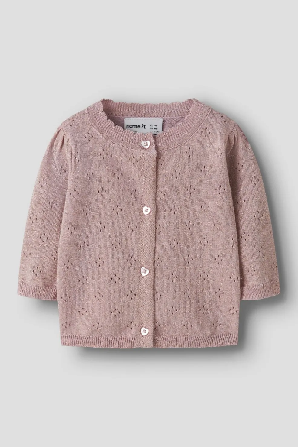 Strikket cardigan fra Name It i lys lilla med glitrende detaljer. Den har en rund halsudskæring, lange ærmer og hjerteformede knapper. Ribkanten giver en god pasform.