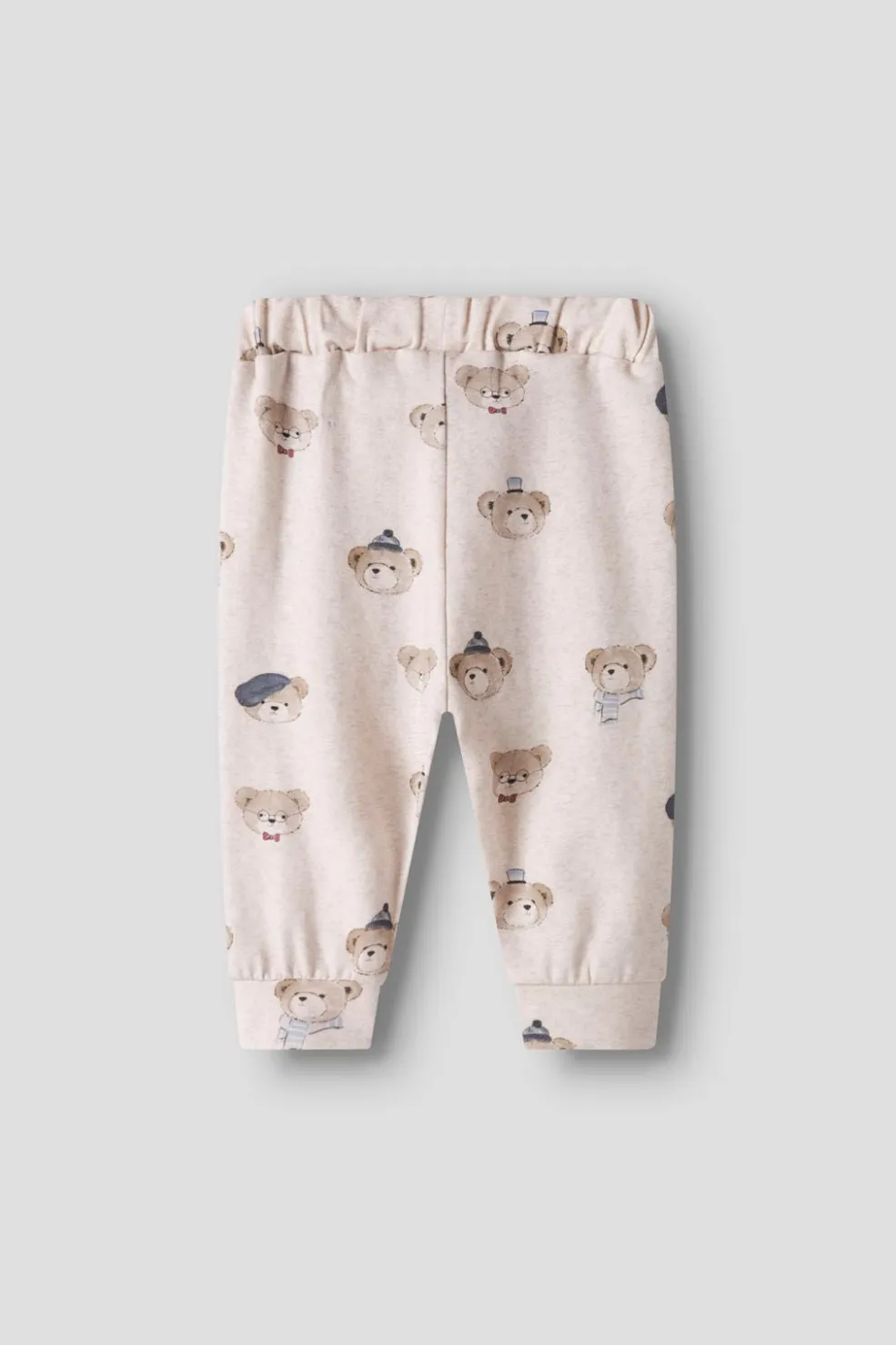 Beige bukser med bjørneprint fra Name It. Bukserne har et sødt mønster med små bjørne, der har hatte og sløjfer på en lys baggrund. De er lavet i en blød og behagelig kvalitet.