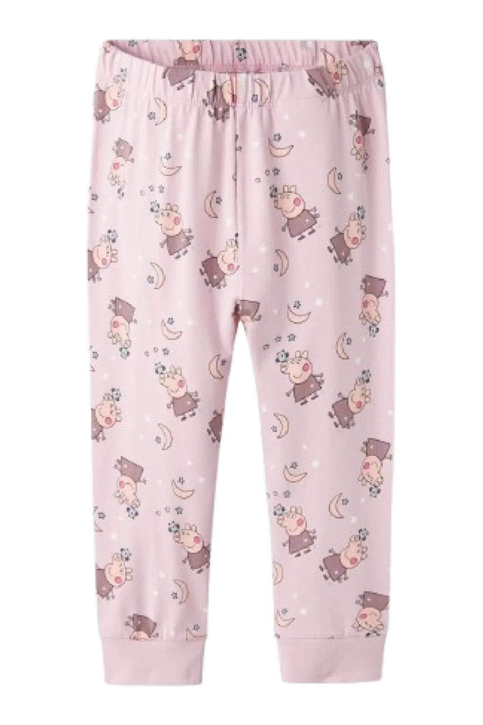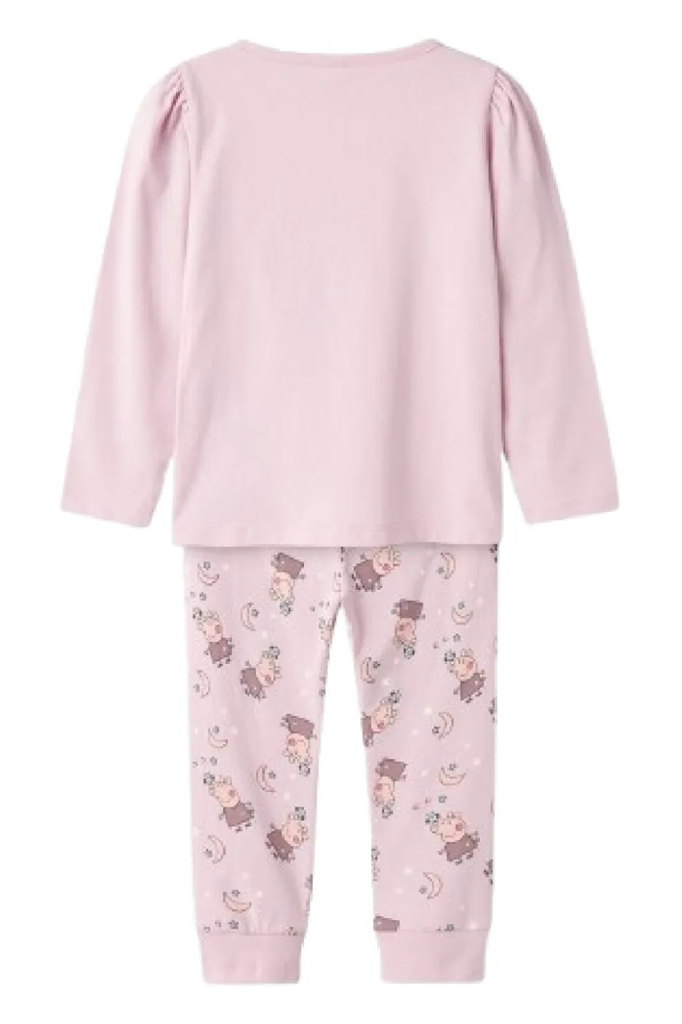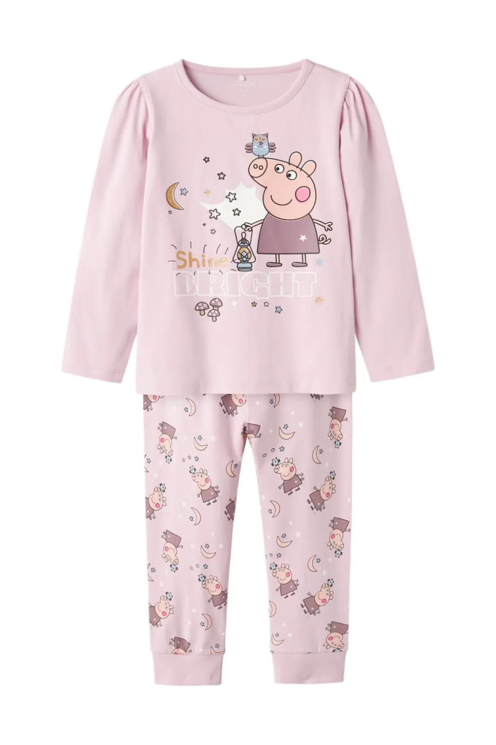 Lyserødt natsæt fra Name It med Peppa-motiv og Shine Bright-tekst på overdelen. Bukserne har et mønster med stjerner og måner.