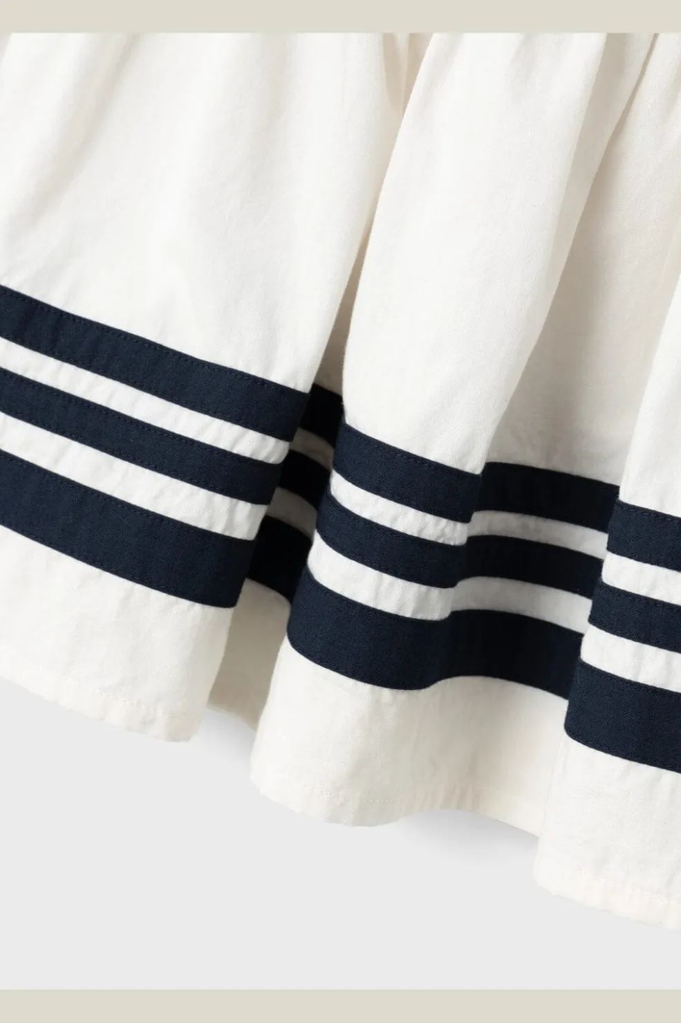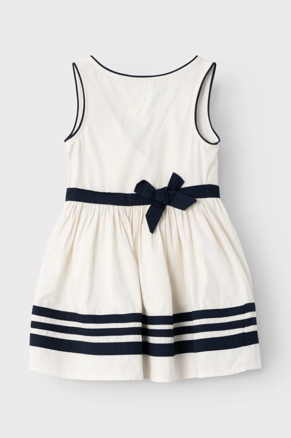 Den ærmeløse kjole har en sløjfe i taljen, der gør det nemt at tilpasse pasformen. De navy striber på den hvide nederdel skaber et maritimt udtryk.