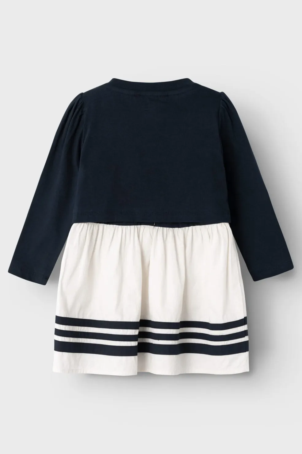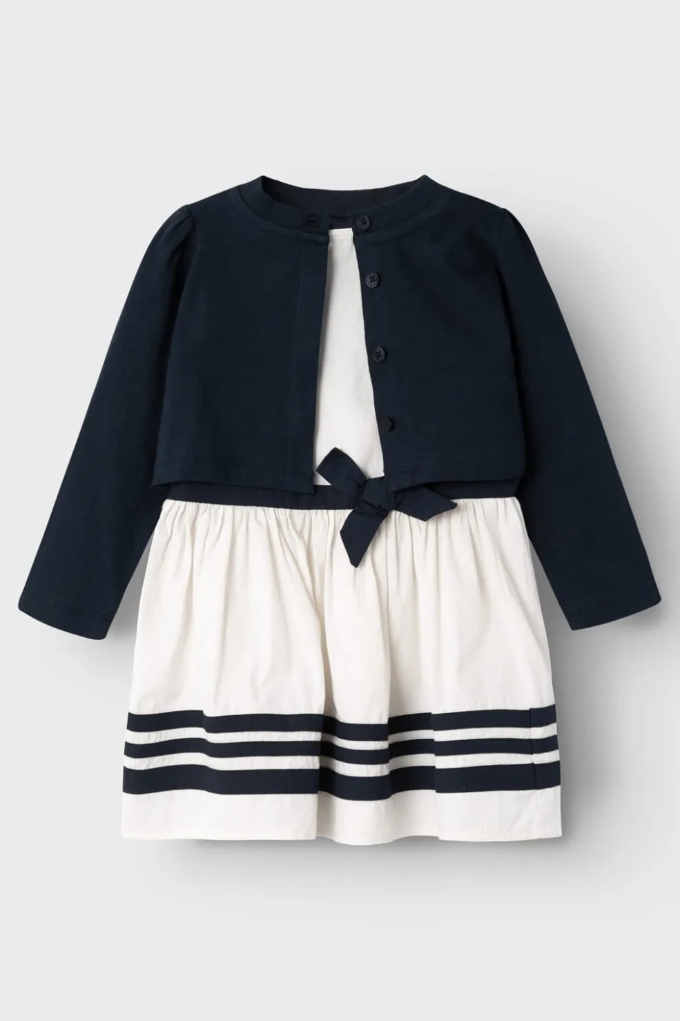 Sæt med kjole og cardigan fra Name It. Kjolen har rund hals og er ærmeløs med hvid nederdel og navy striber. Den matchende cardigan har knapper og er navyfarvet.
