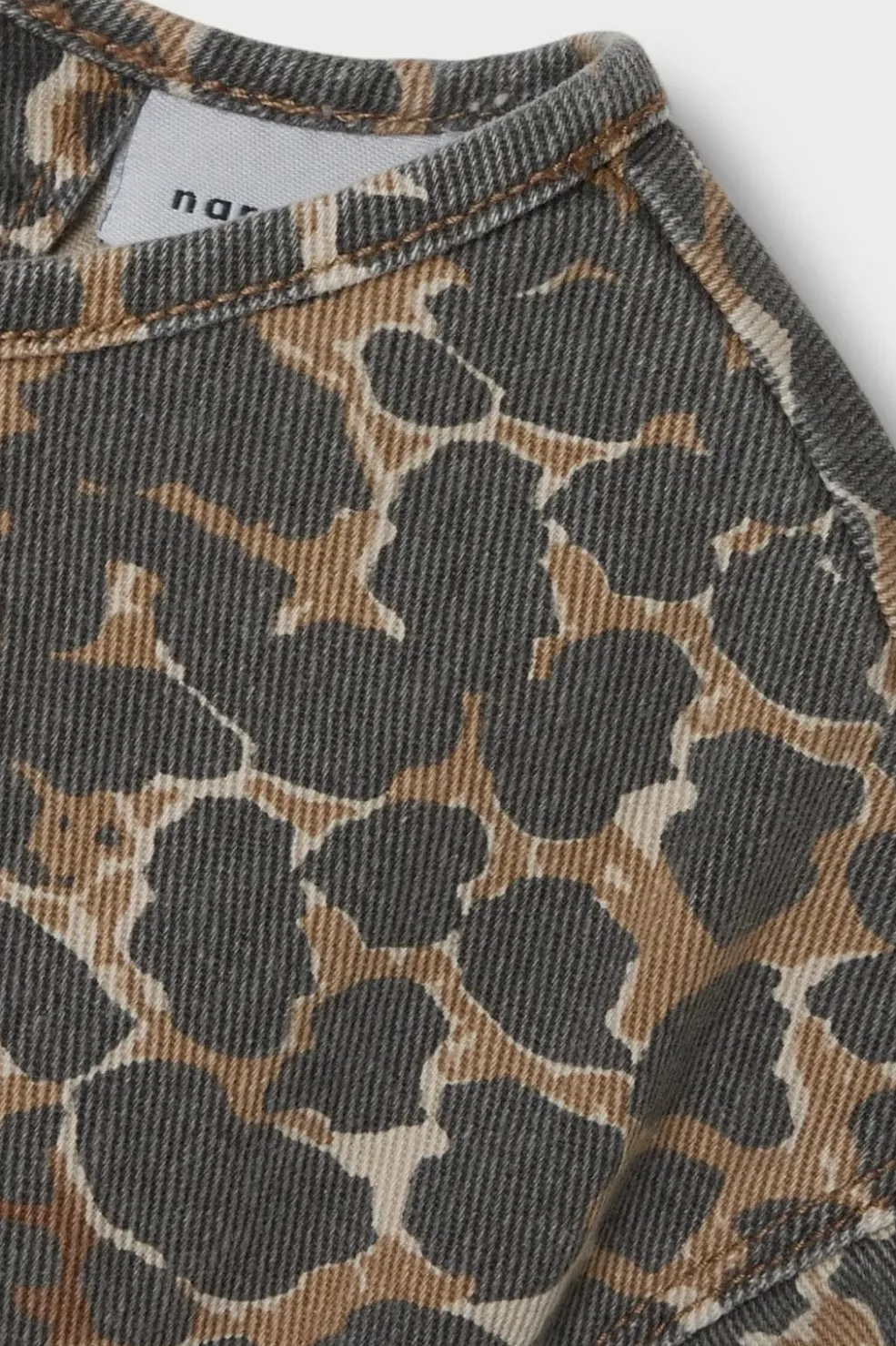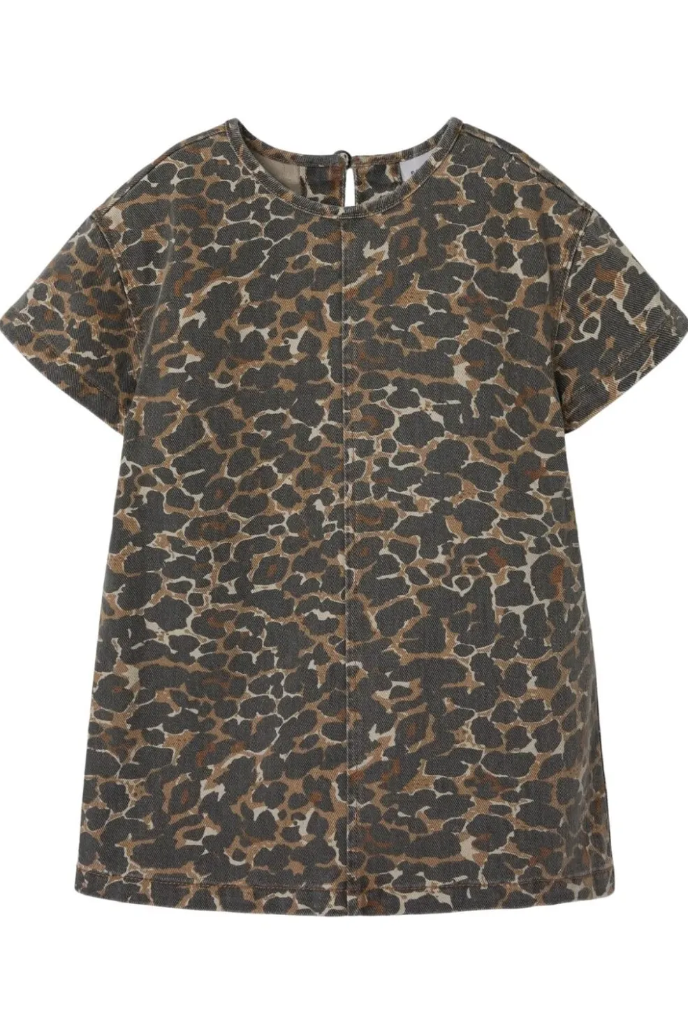 Twillkjole med leopardprint i brune og grå nuancer fra Name It. Den har rund hals, korte ærmer og en oversize pasform.