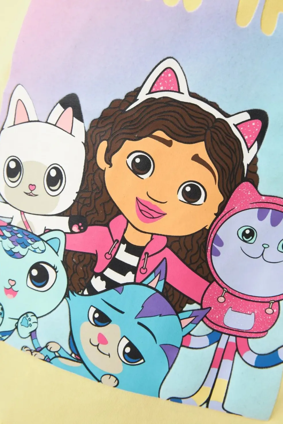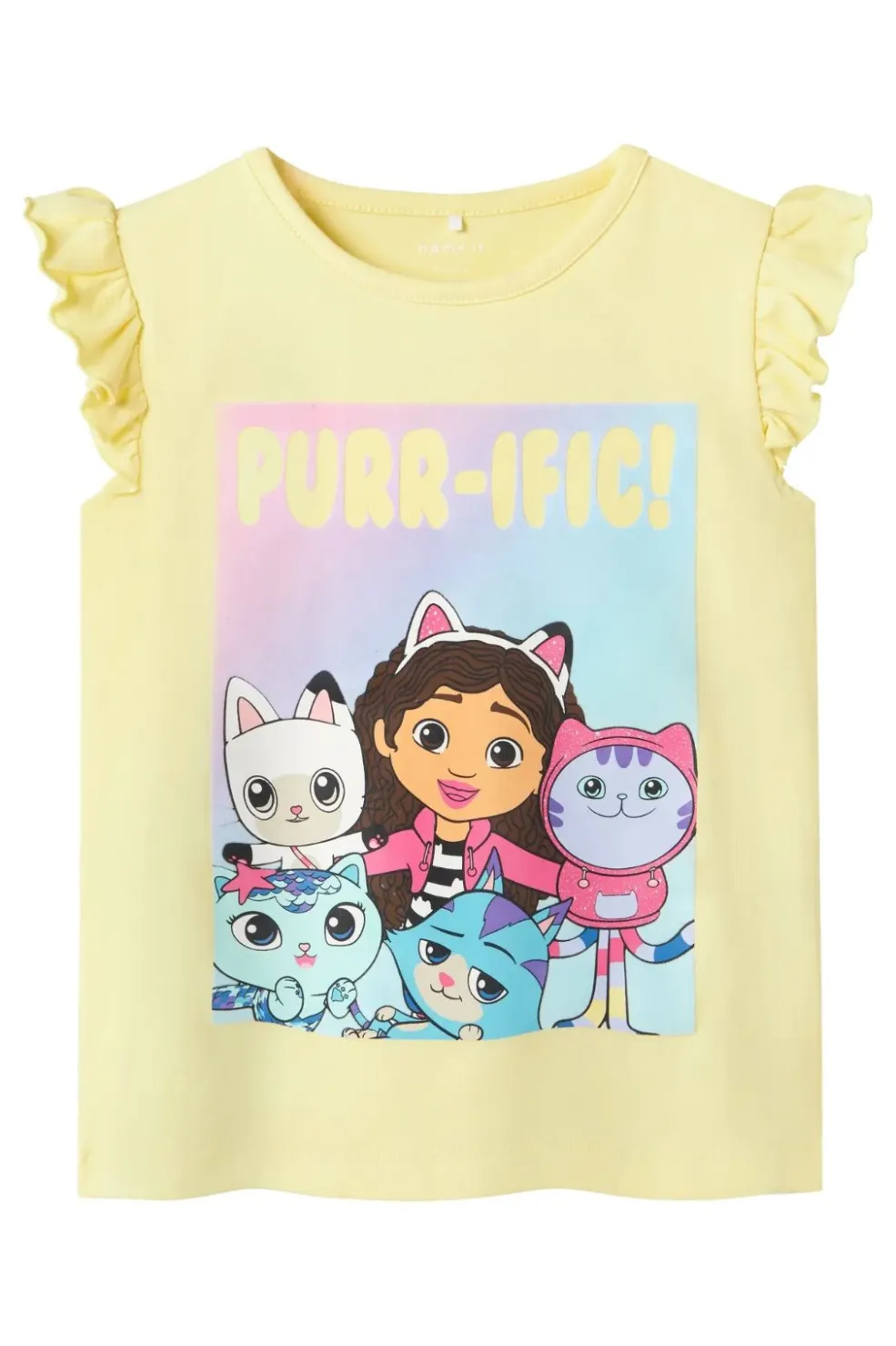 Gul t-shirt fra Name It med korte ærmer og flæsekanter. På forsiden er der et farverigt print med katte og en pige på en regnbuefarvet baggrund.