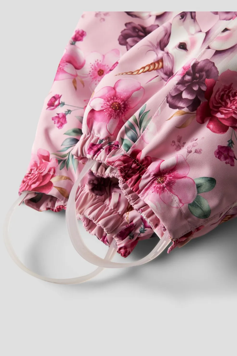 Lyserød flyverdragt fra Name It med blomster- og enhjørningsmønster. Dragten har en høj hals, lynlås og trykknapper samt hætte med pelskant.