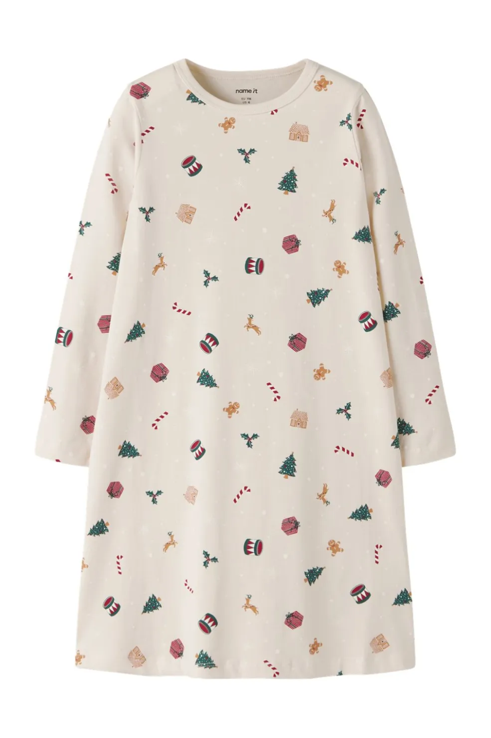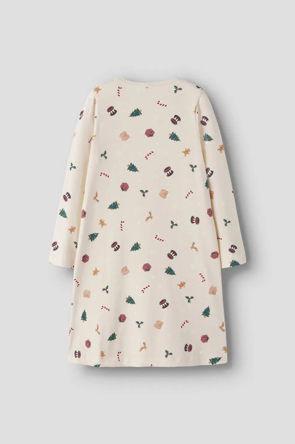 Lysegrå natkjole fra Name It med juletema-print af gaver, juletræer og peberkagemænd. Den har rund halsudskæring og lange ærmer til de kølige nætter.