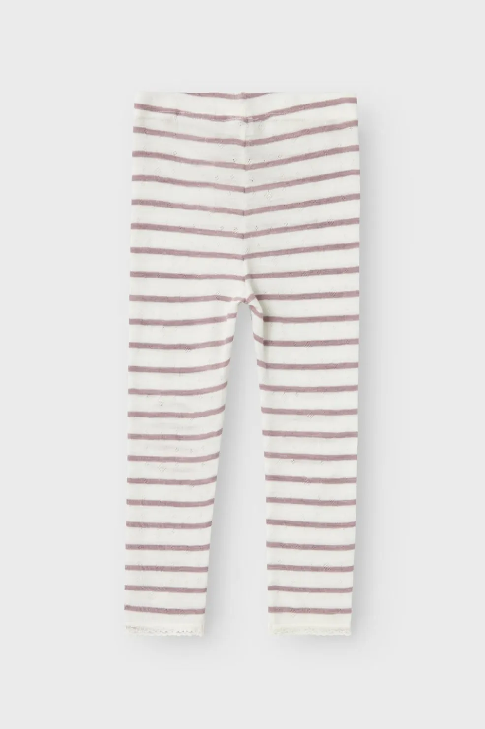 Hvide leggings med lilla striber fra Name It. Strikket i merinould med needle drop-mønster og forstærkede knæ til aktiv brug.