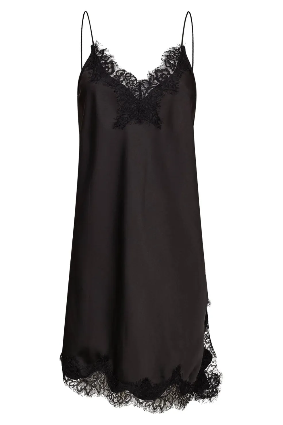 Sort lingerie-kjole fra Haute L’Amitié med blondekanter ved halsudskæringen og forneden. Kjolen har tynde stropper og et asymmetrisk snit.