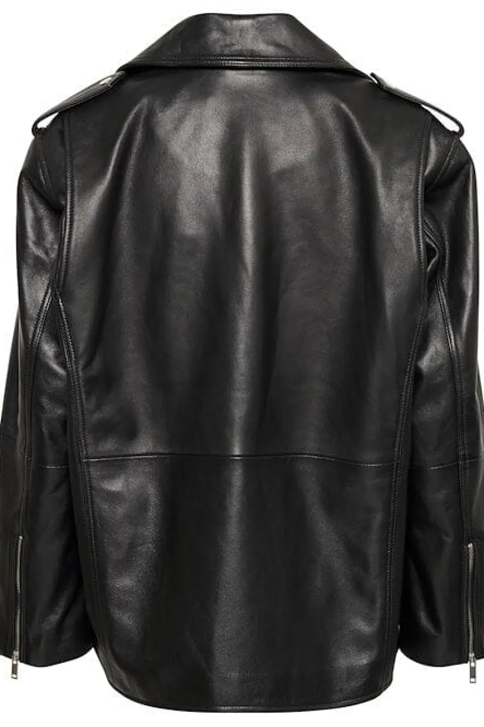 Sort læderjakke fra Gestuz med bikerstil-design. Jakken har skjortekrave, lynlåslukning og flere lommer på fronten. De dekorative syninger giver jakken et råt udtryk.
