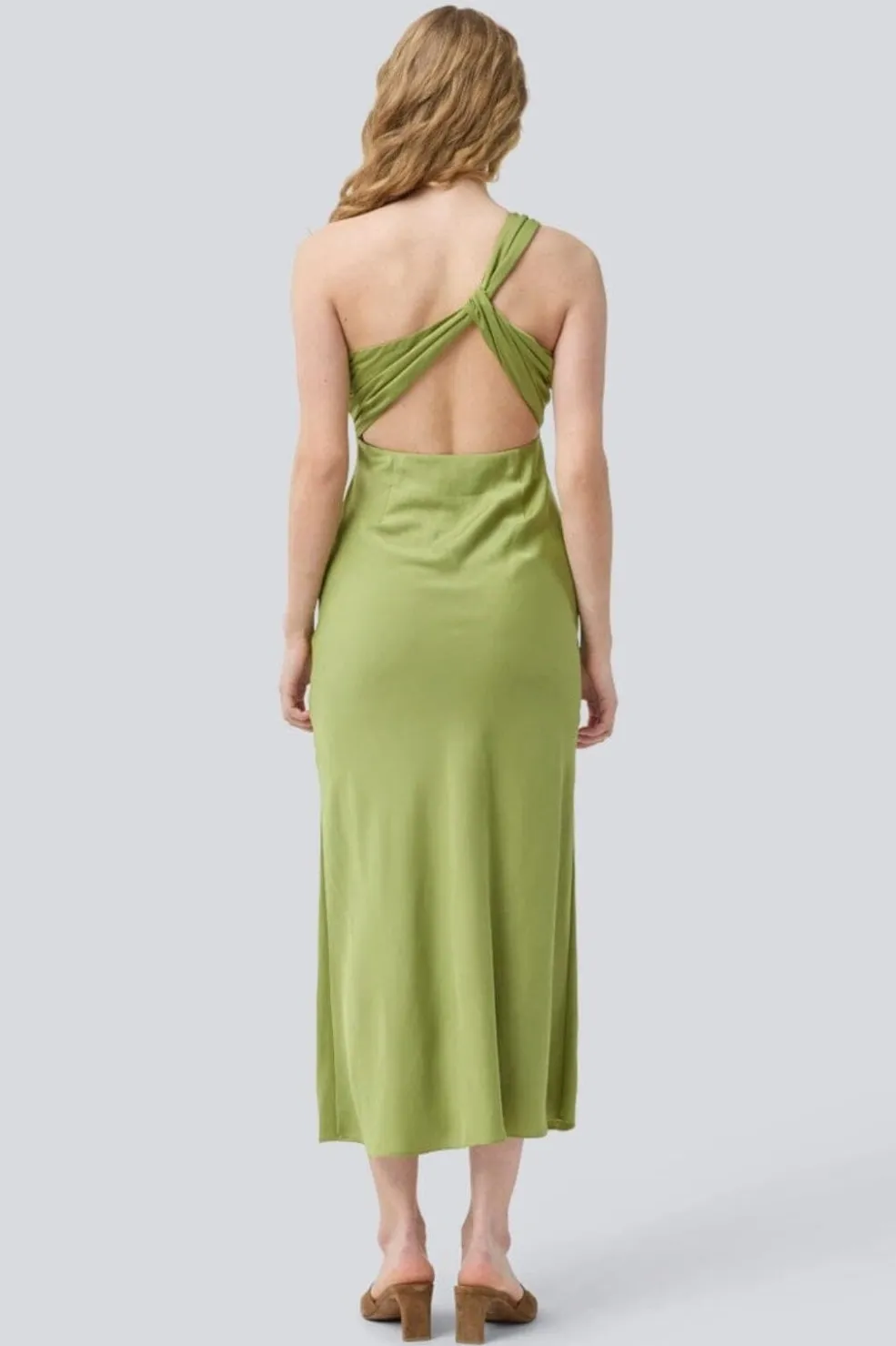 Grøn kjole fra Modström med en-skulder design. Den flydende silhuet og den åbne ryg skaber et rent og enkelt udtryk. Kjolen har en skjult lynlås i siden.