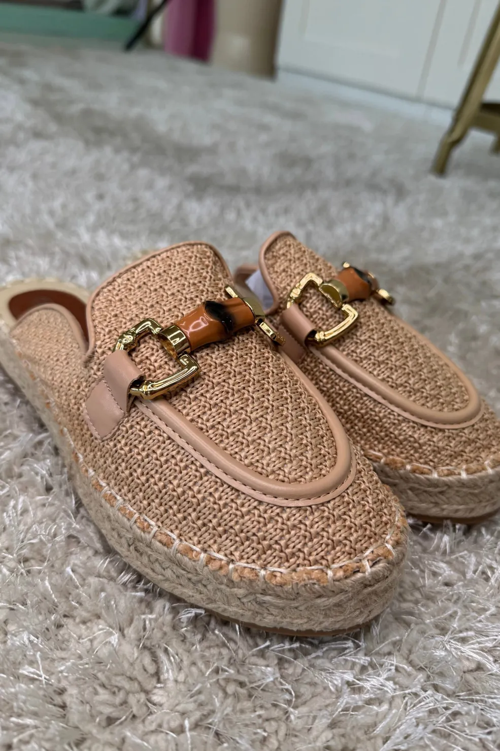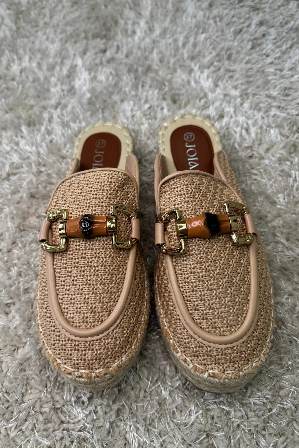 Beige mules fra Bloom med platå og mandeltåform. Skoene har et strikket tekstilmønster og et dekorativt metalspænde på oversiden.