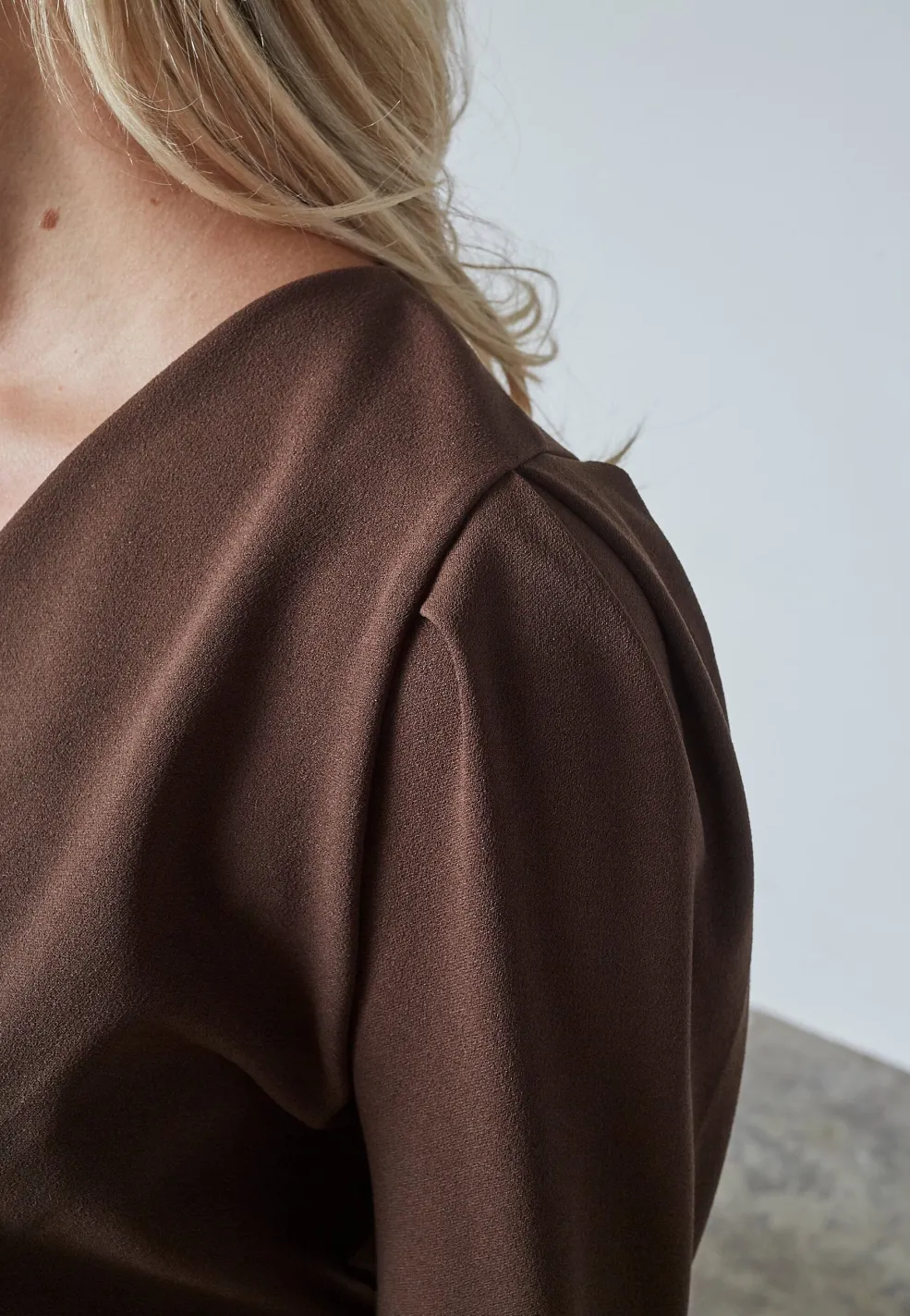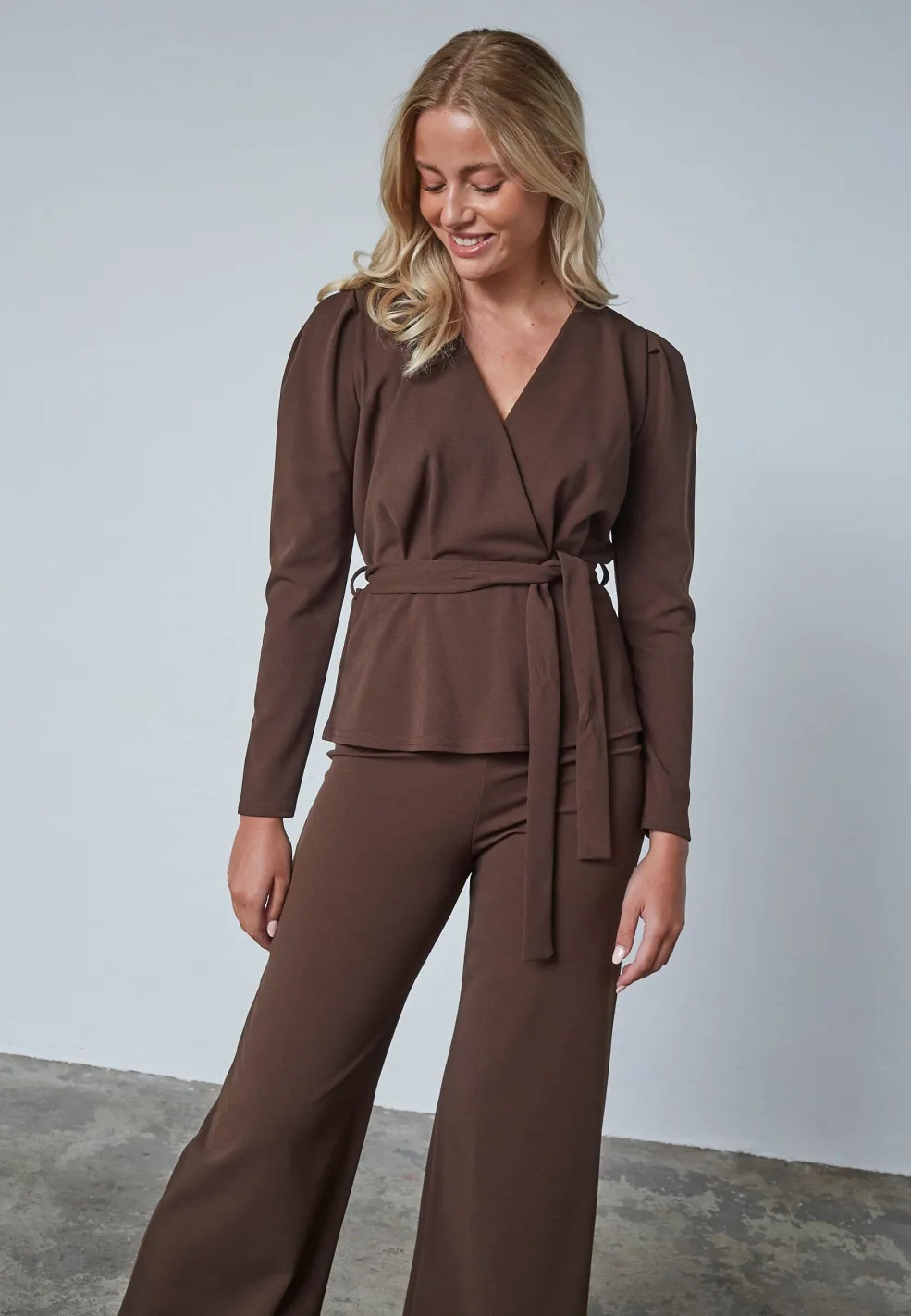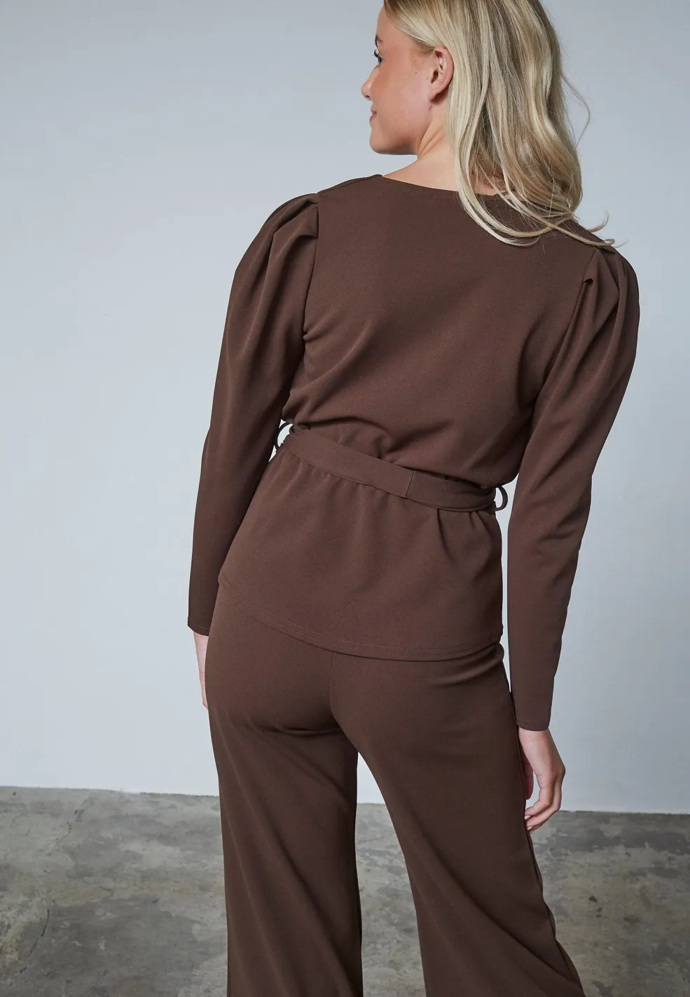 Brun bluse fra Sisters Point med wrap-design og bælte i taljen. Blusen har en dyb V-hals og lange ærmer med let puffede skuldre.
