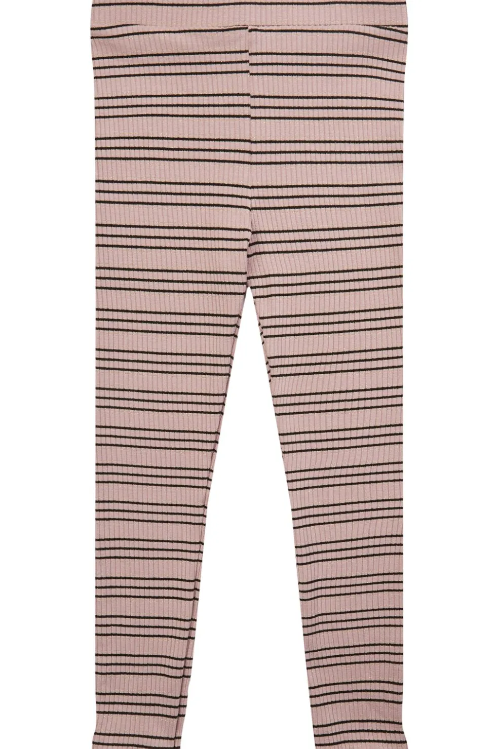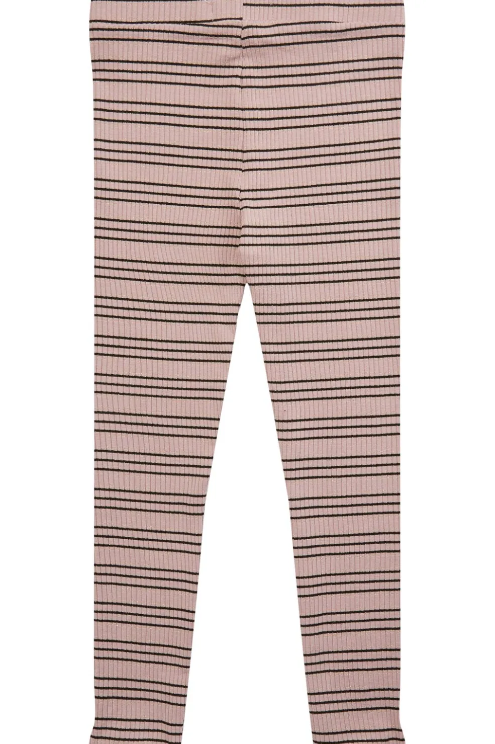Lyserøde leggings fra Liberté med sorte striber og bølgede kanter i bunden. De har en høj talje og ankellængde, og stoffet har et skinnende lurex-look.