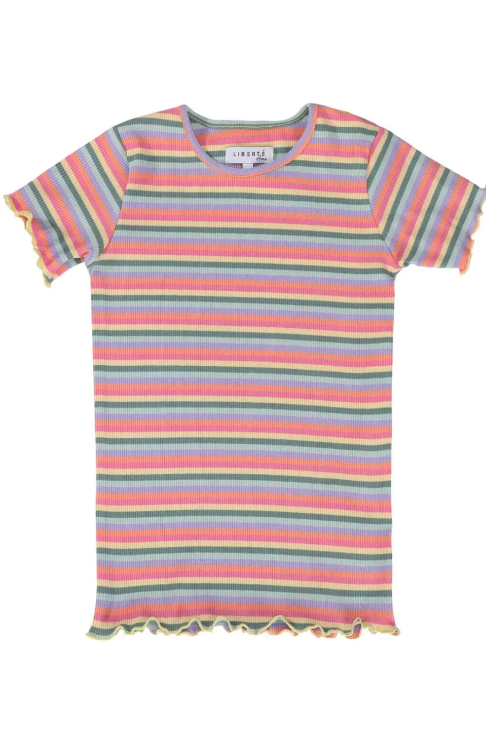 Stribet bluse fra Liberte Ami i ribbet stof med flerfarvede striber i orange, pink, grøn og blå. Den har korte ærmer med flæsekanter og en rund halsudskæring.