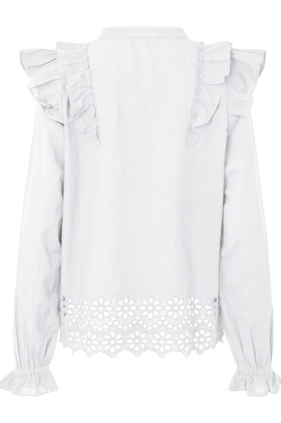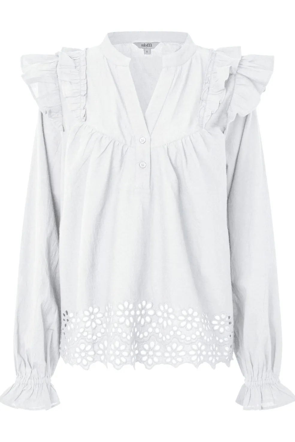 Hvid bomuldsskjorte fra MbyM med blomsterbroderi og flæsedetaljer. Skjorten har en V-hals med knaplukning foran og lange ærmer med samlede manchetter.