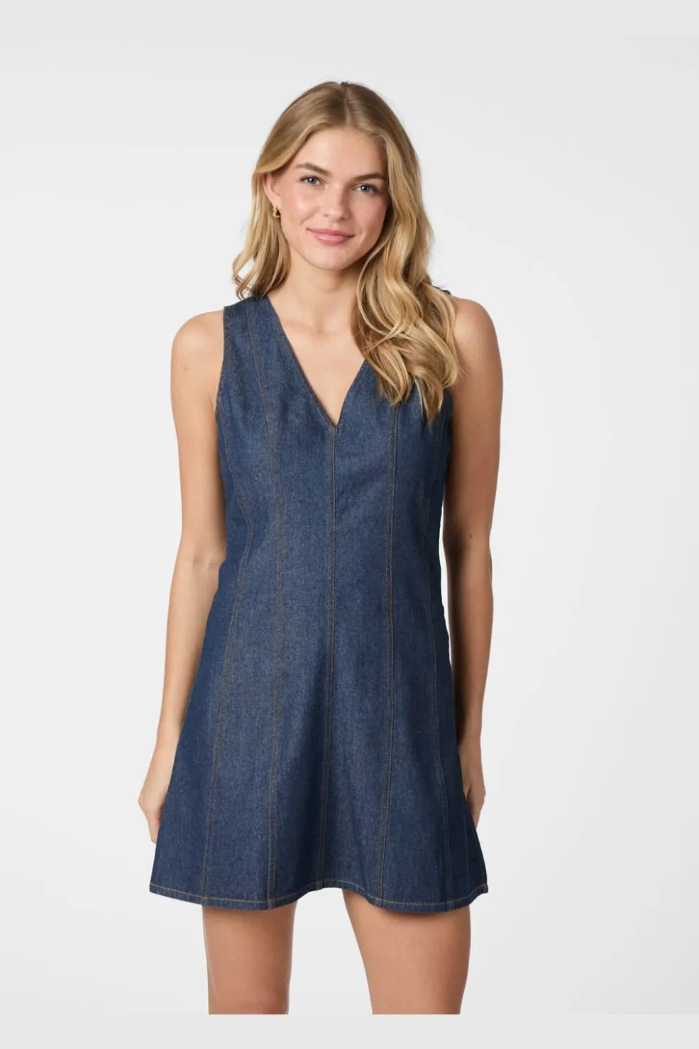 Mørkeblå denimkjole fra Neo Noir med A-linje-silhuet. Kjolen har V-hals og ærmeløst design med synlige kontrastsyninger, der fremhæver A-linjen.