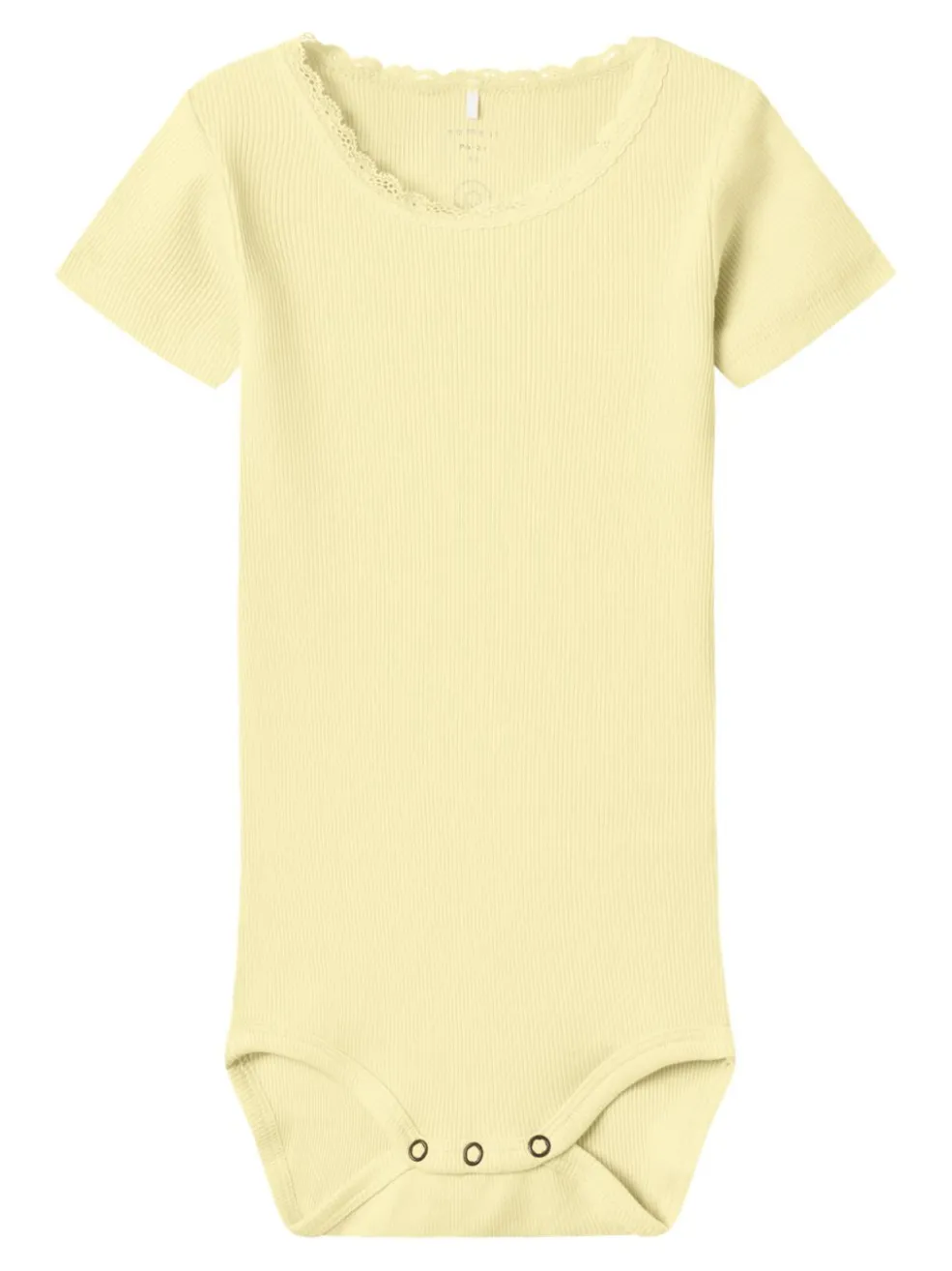 Pastellgul body fra Name It med ribbet tekstur. Den har korte ærmer, rund halsudskæring med blondedetaljer og trykknapper i bunden for nem påklædning.
