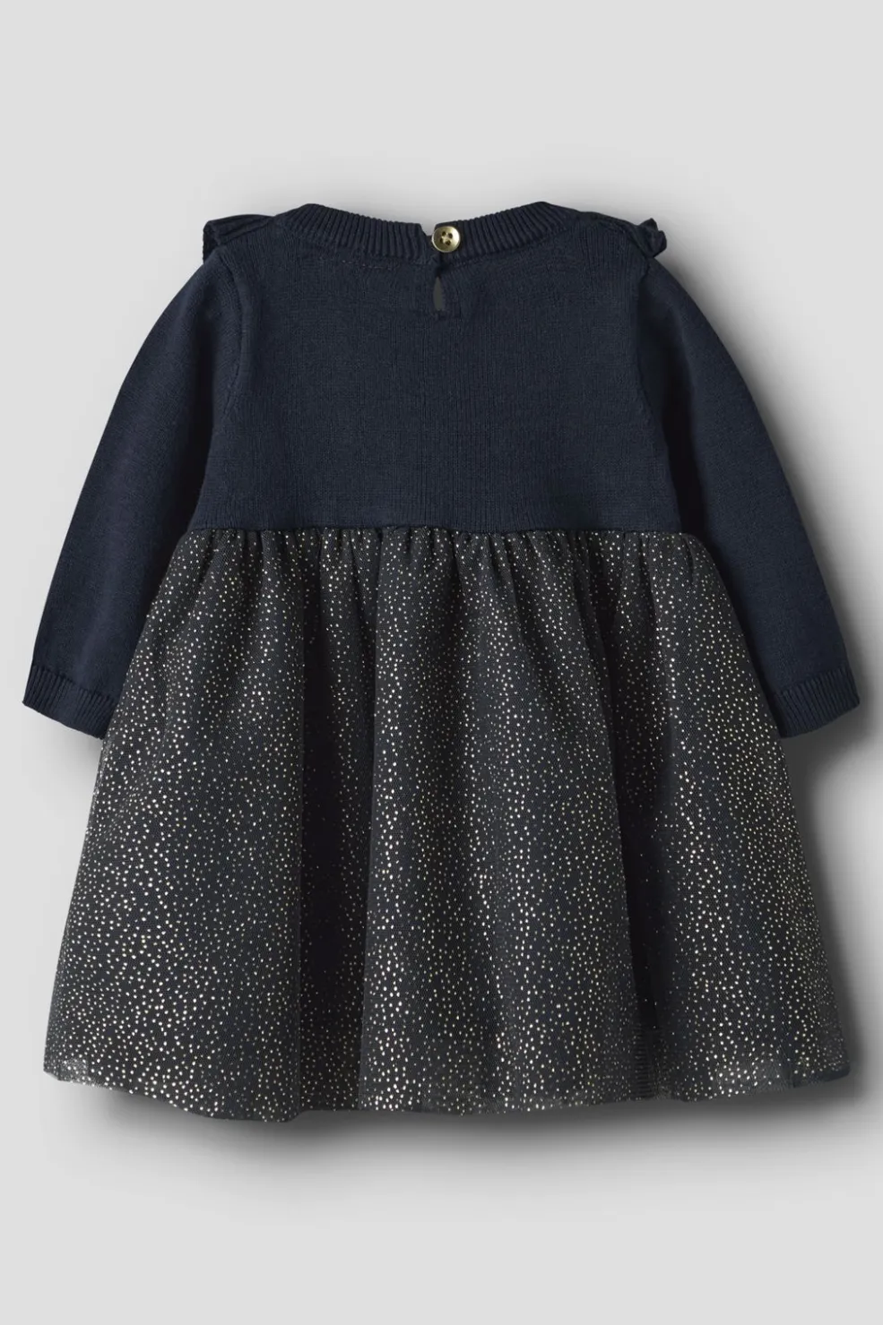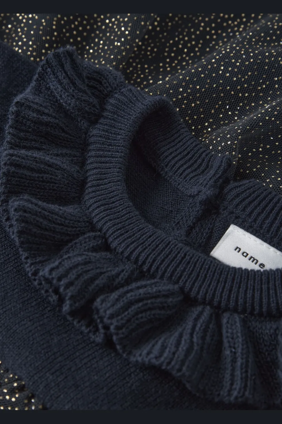 Strikket kjole fra Name It i mørkeblå med flæsekrave. Overdelen er i strik, og underdelen har et fint prikket mønster med glimmer. Kjolen har knapper bagpå.