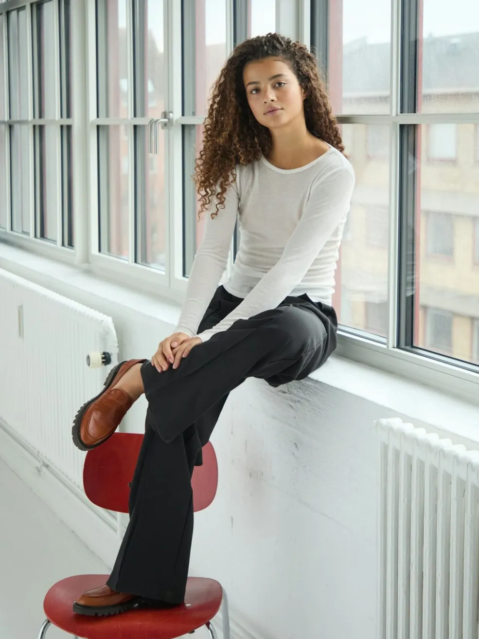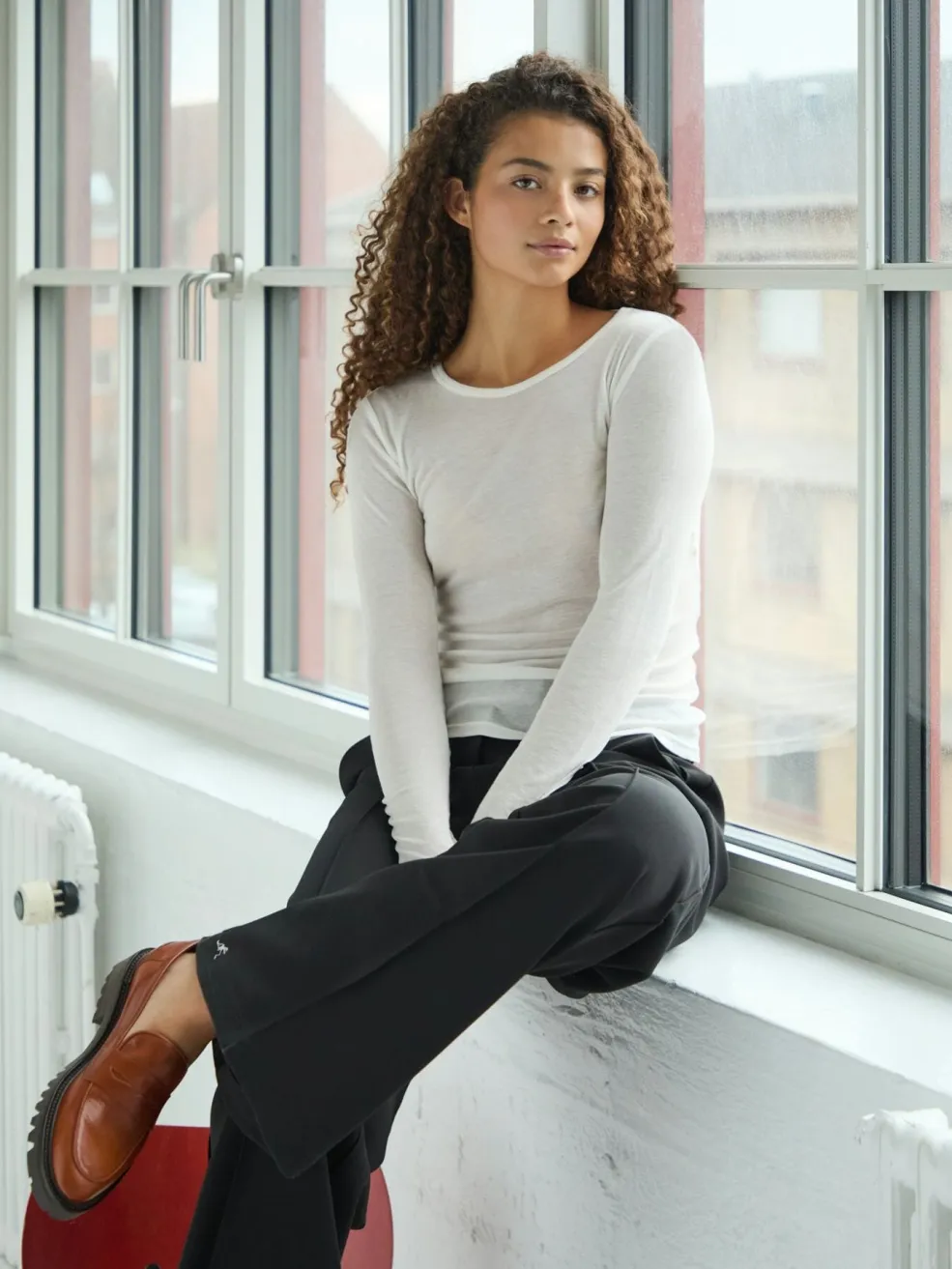 Hvid ribbluse fra Neo Noir med rund hals og lange ærmer. Blusen har en tætsiddende pasform og er lavet af en blød og let ribstrikket kvalitet.
