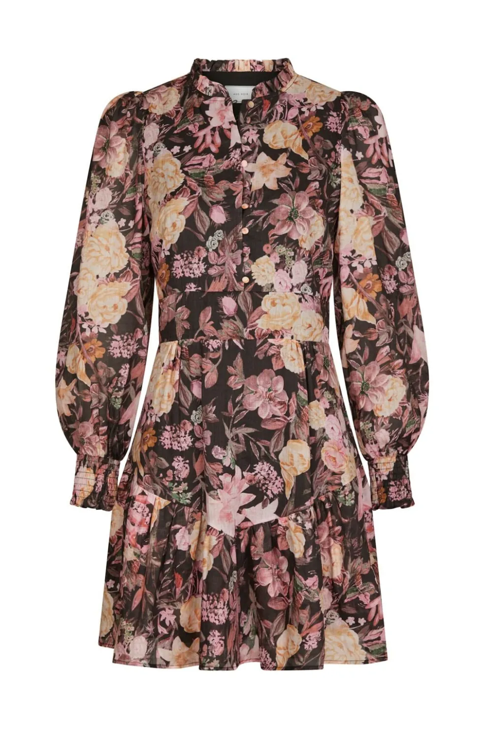 Sort kjole fra Neo Noir med store blomster i pink, gul og grøn. Kjolen har høj hals, lange puffærmer og knapper foran. En flæsekant i bunden giver kjolen et feminint præg.