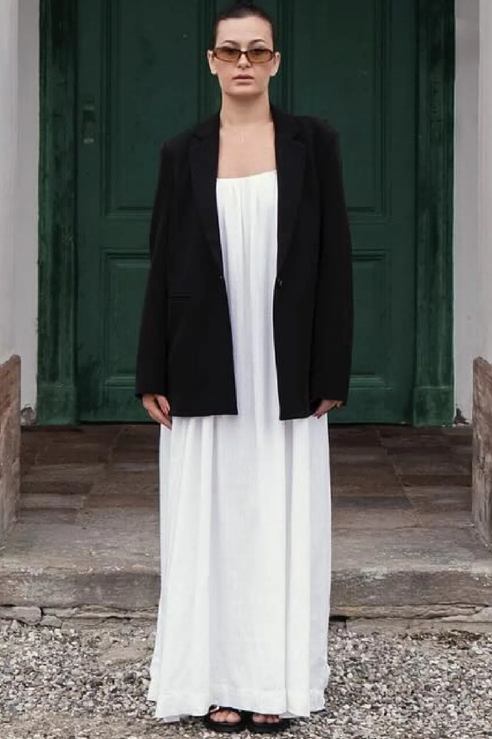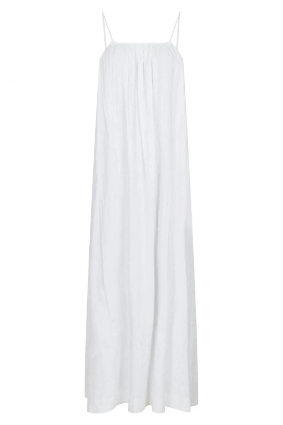 Hvid kjole fra Neo Noir med tynde stropper og løs pasform. Kjolen har en elastisk ryg og flæsedetaljer, der giver den et let og luftigt udtryk.