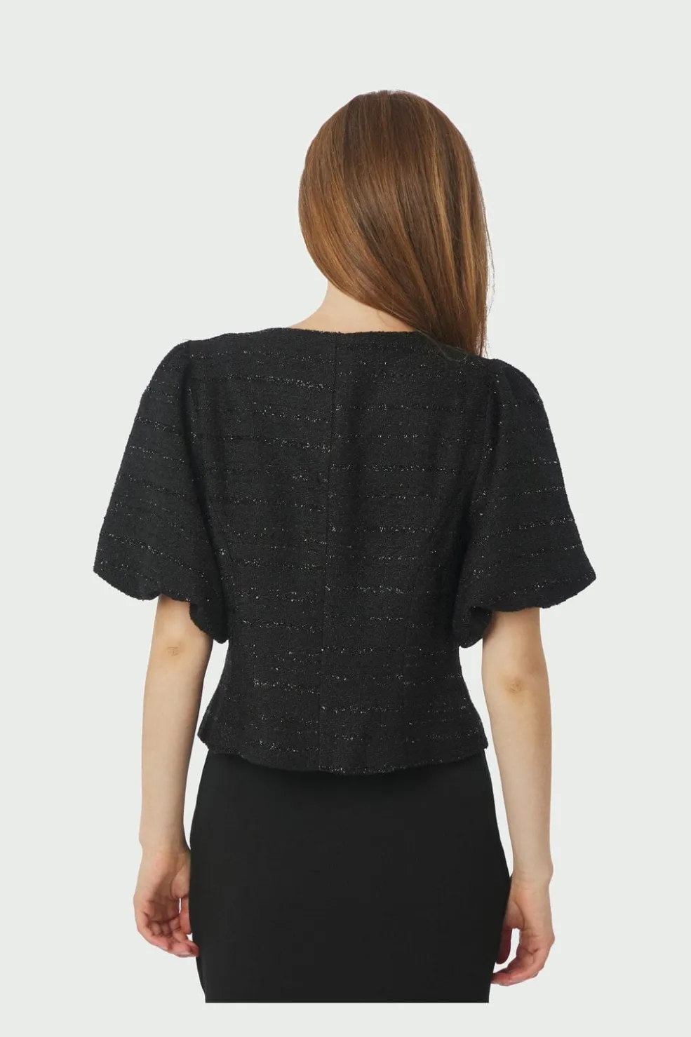 Sort bluse fra Neo Noir i boucle-stof med glimmereffekt i de vandrette striber. Blusen har pufærmer og knaplukning foran samt en kropsnær pasform ved taljen.