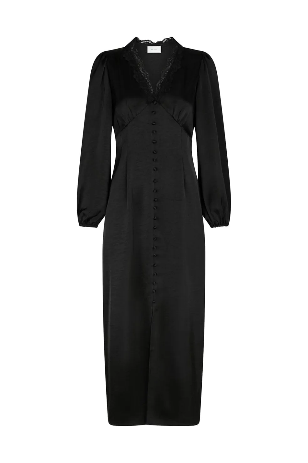 Sort satinkjole fra Neo Noir med knapper langs fronten. Kjolen har V-hals med blondekant og 3/4-lange ærmer med let puf. Den lange model er lavet i tung satin.
